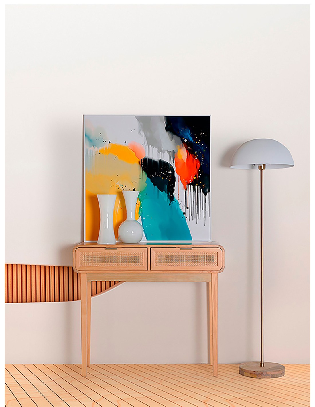 Set de 2 cuadros Krysta de estilo Contemporáneo, fabricados enDM color blanco, en combinación con metacrilato multicolor con acabado impreso.