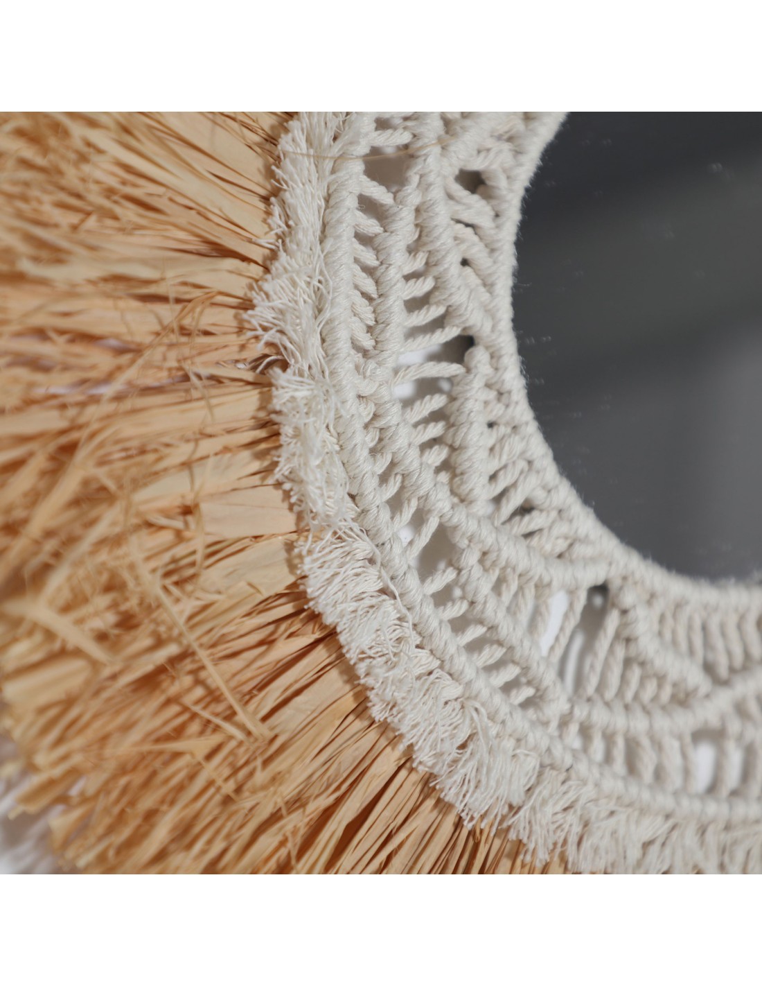 Espejo redondo Kasses de estilo Boho, fabricado en rafia en color marrón, combinado con plástico y cuerda. Espejo plástico.