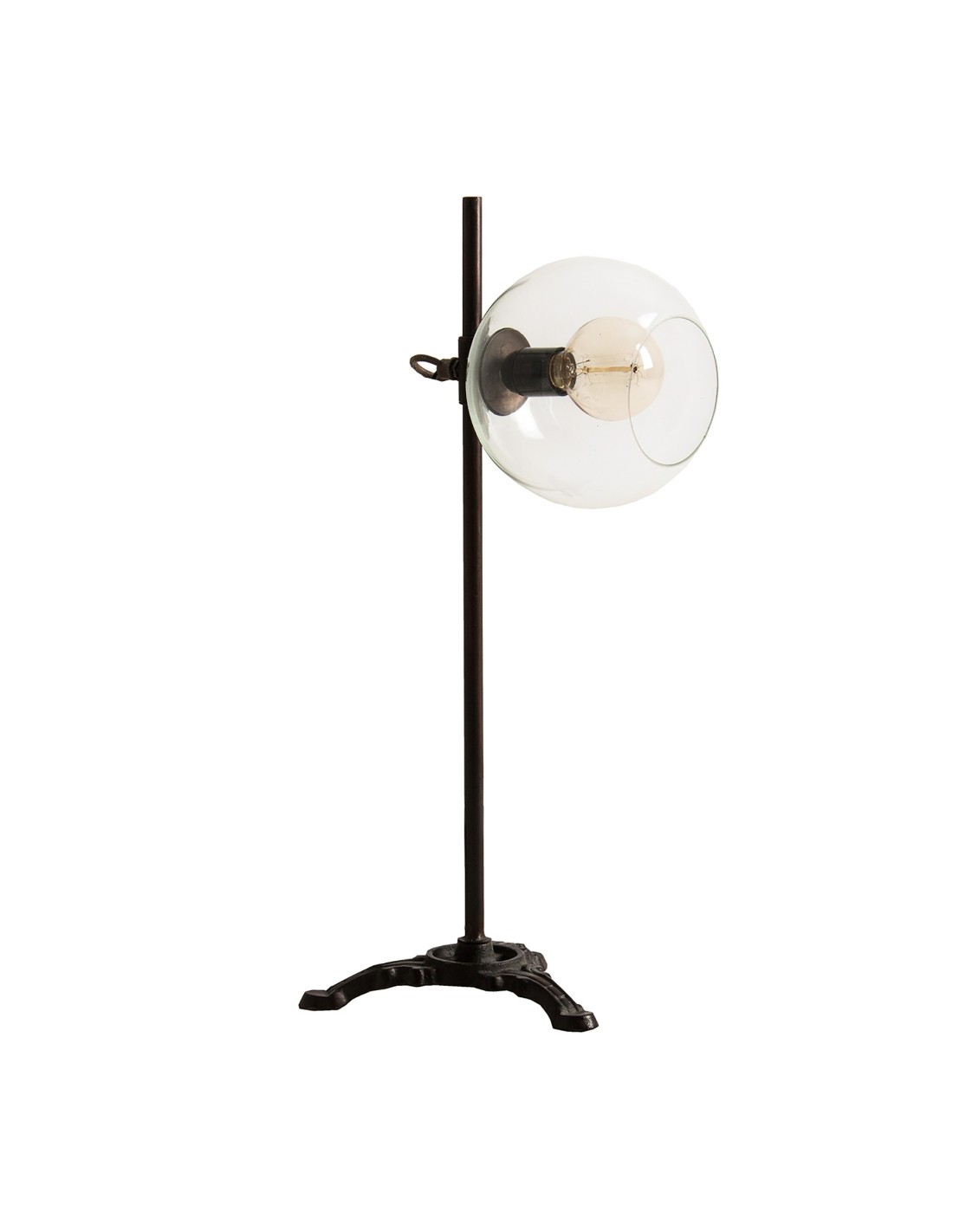 Lámpara de sobremesa abstracta Flessie de estilo Industrial, fabricada en hierro en color negro, combinado con vidrio acabado transparente. Producto desmontable.