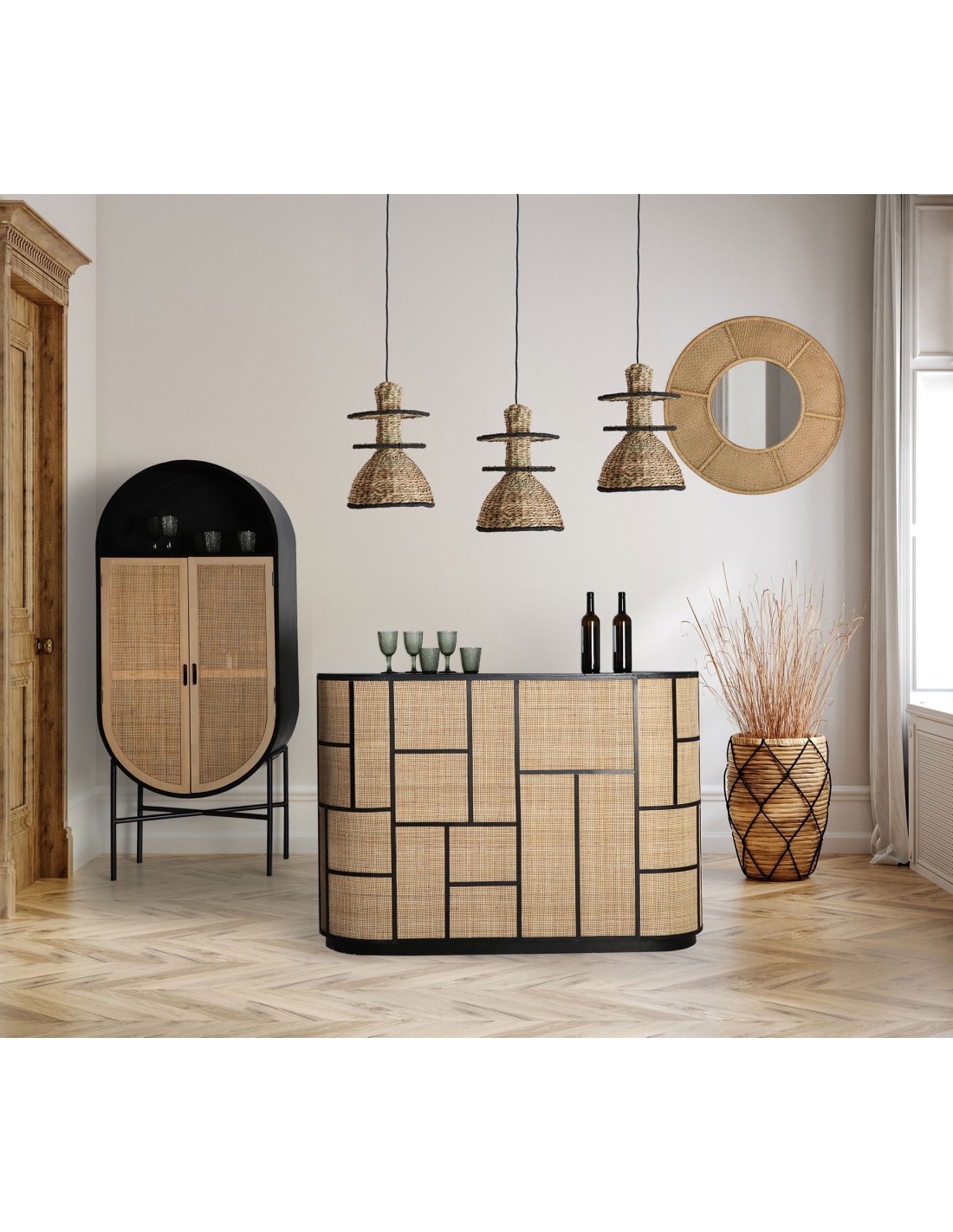 Lámpara de techo redonda Kasses de estilo Boho, fabricada en fibra natural en color negro, combinado con cuerda en color natural y hierro.
