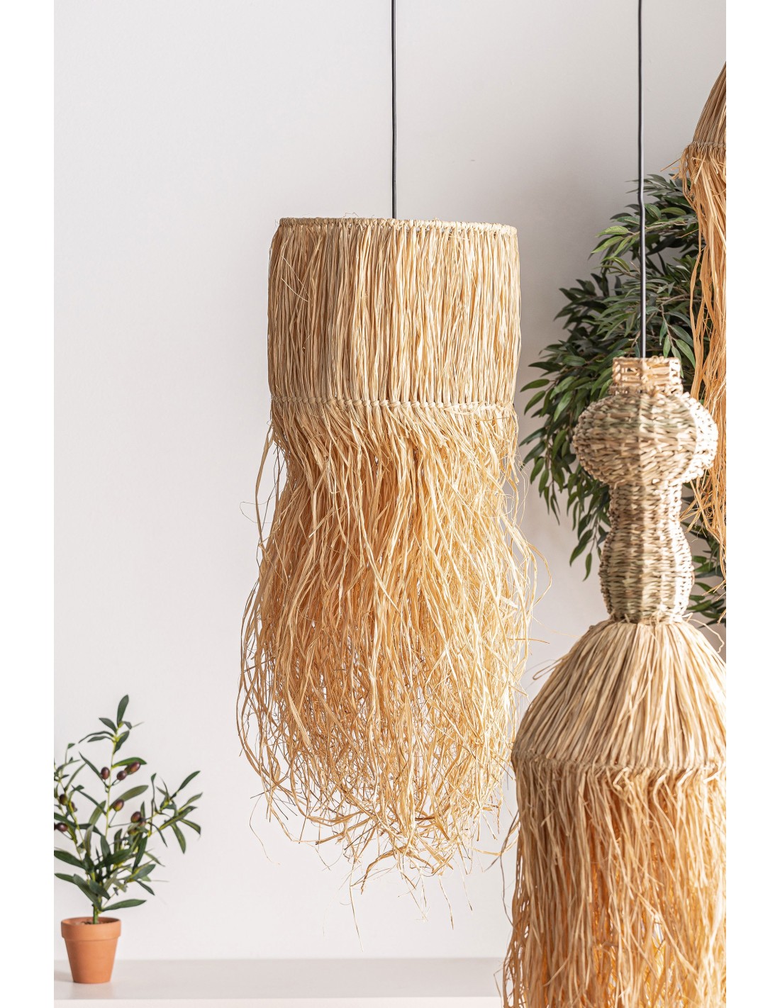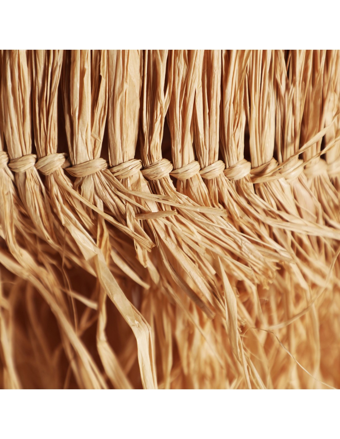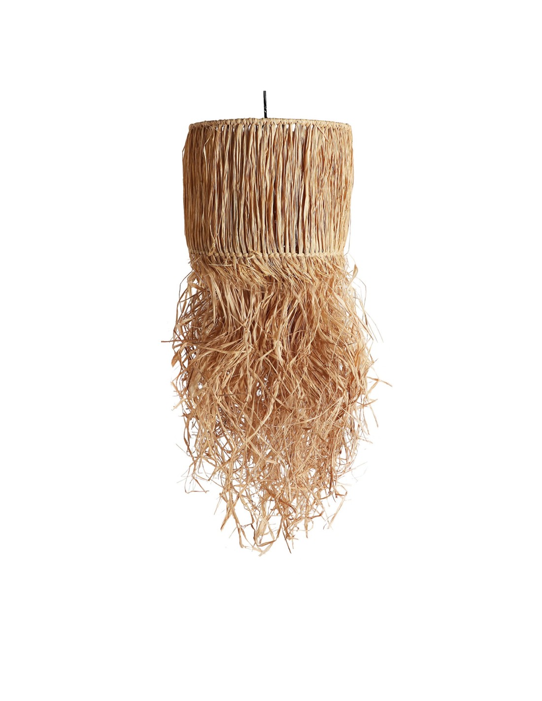 Lámpara de techo redonda Kasses de estilo Boho, fabricada en fibra natural en color marrón, combinado con rafia y hierro.