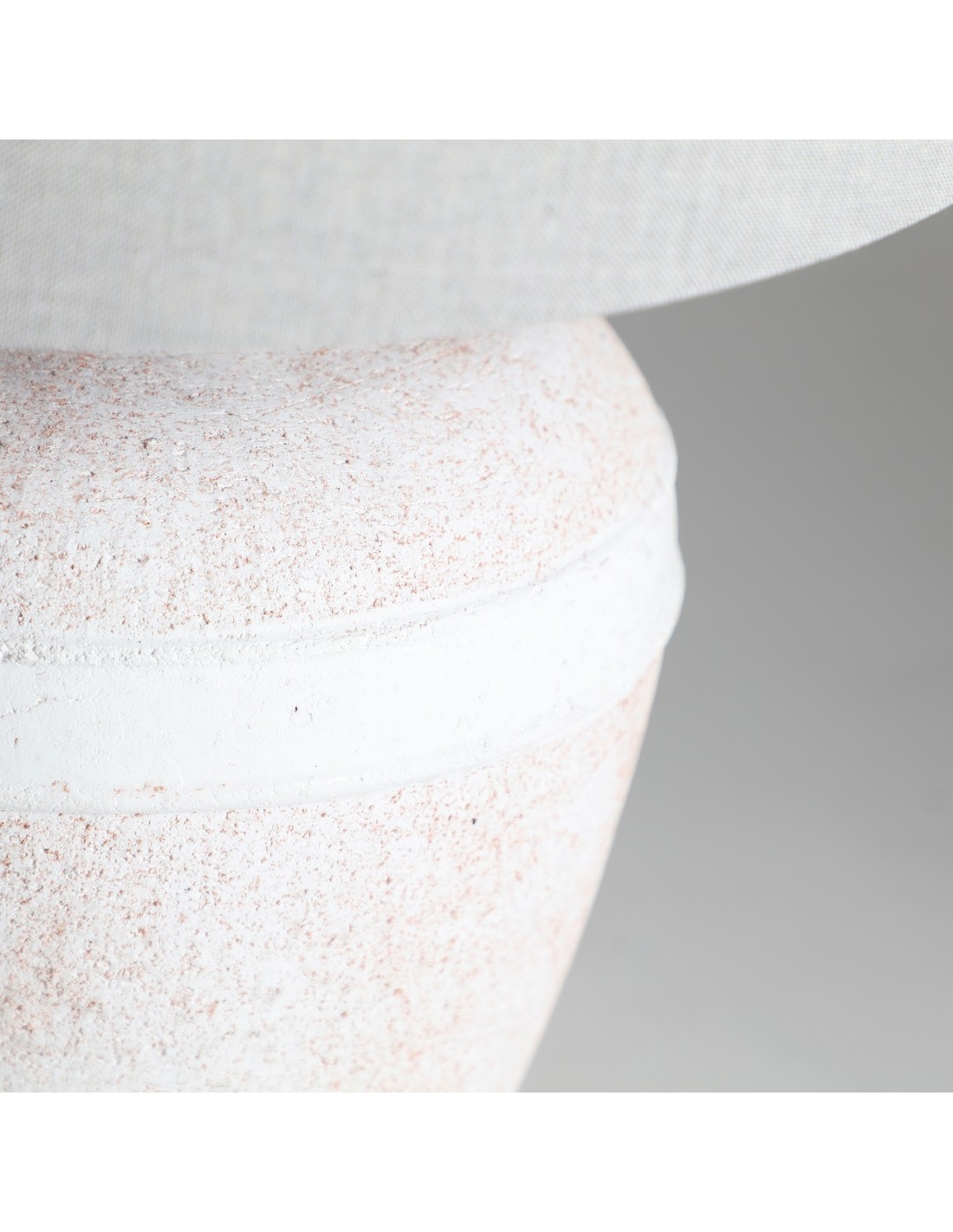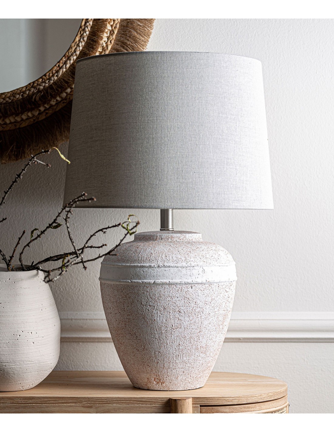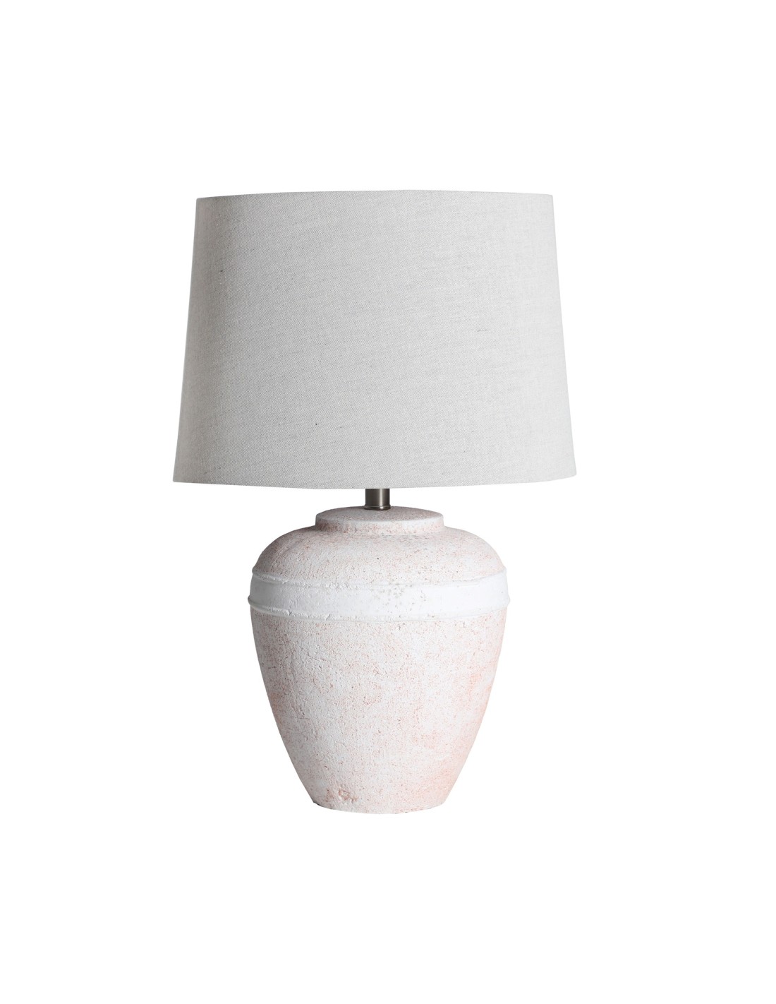Lámpara de sobremesa Helina de estilo Provenzal, fabricada en cerámica en tonos claros con acabado envejecido, combinado con hierro en color plata y lino en color blanco roto. Producto desmontable.