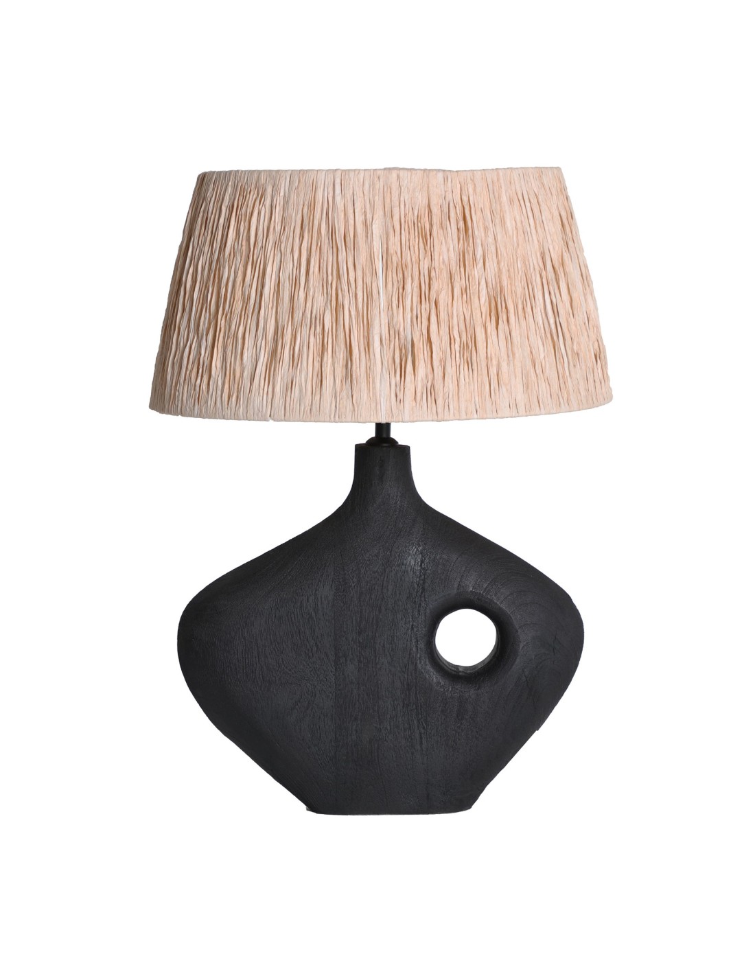 Lámpara de sobremesa rectangular de estilo Contemporáneo, fabricada en madera de mango color negro con acabado mate, combinado con rafia en color marrón claro. Producto desmontable.
