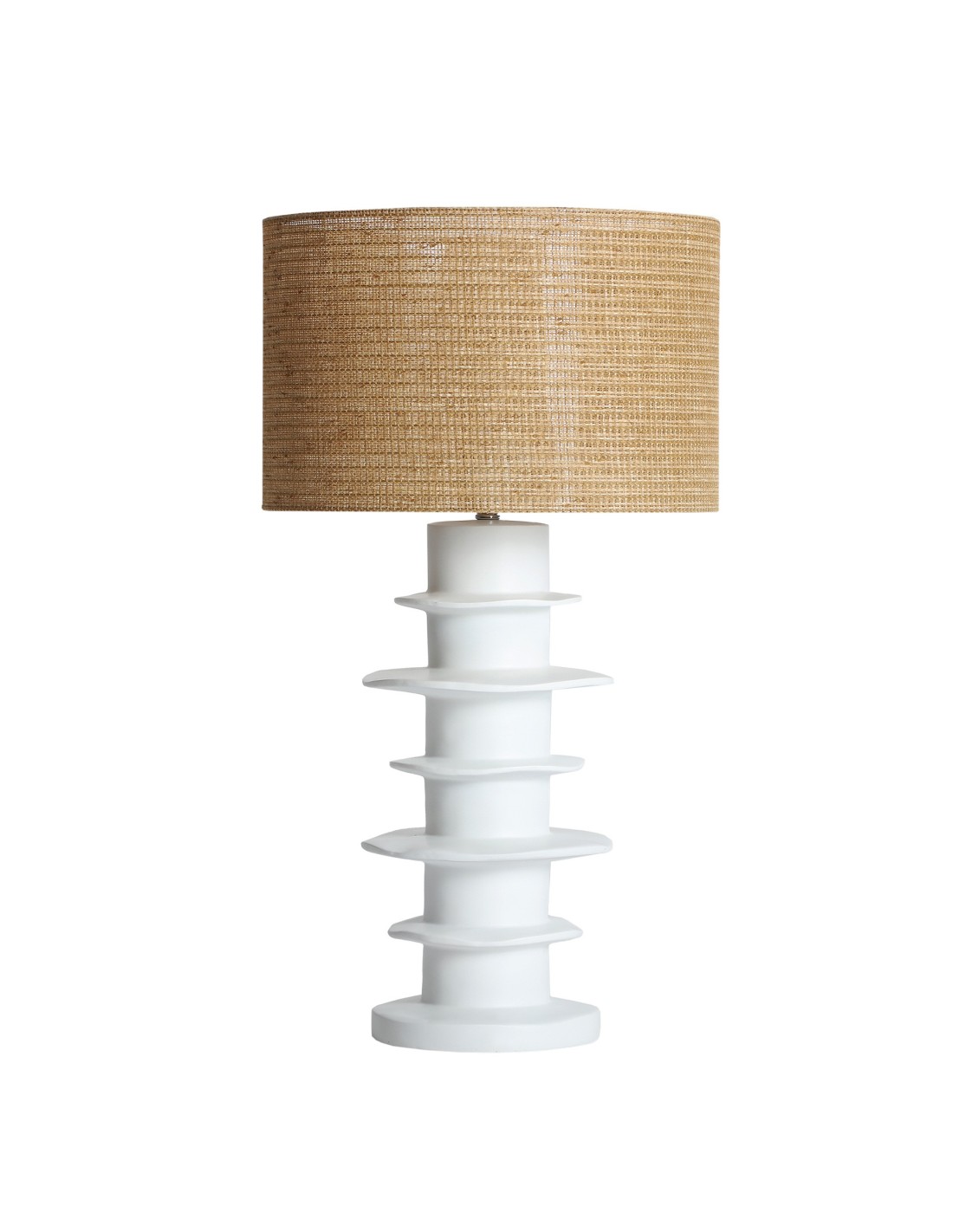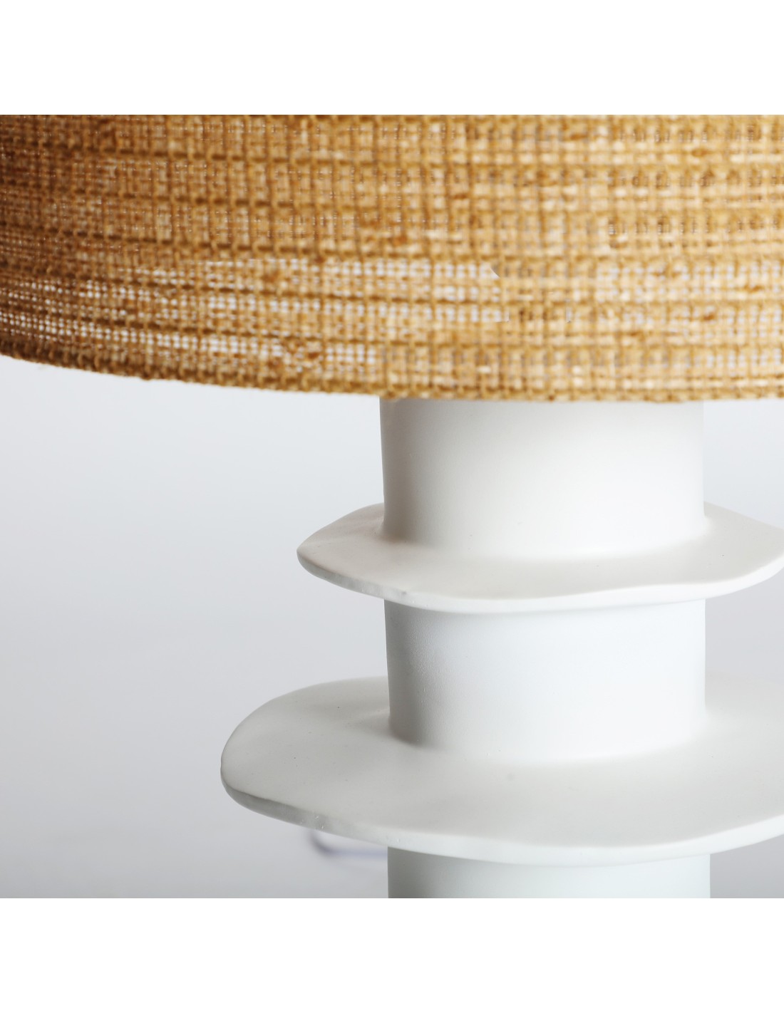 Lámpara de sobremesa Faroa de estilo Contemporáneo, fabricada en cerámica color blanco con acabado mate, combinado con rafia color marrón. Producto desmontable.