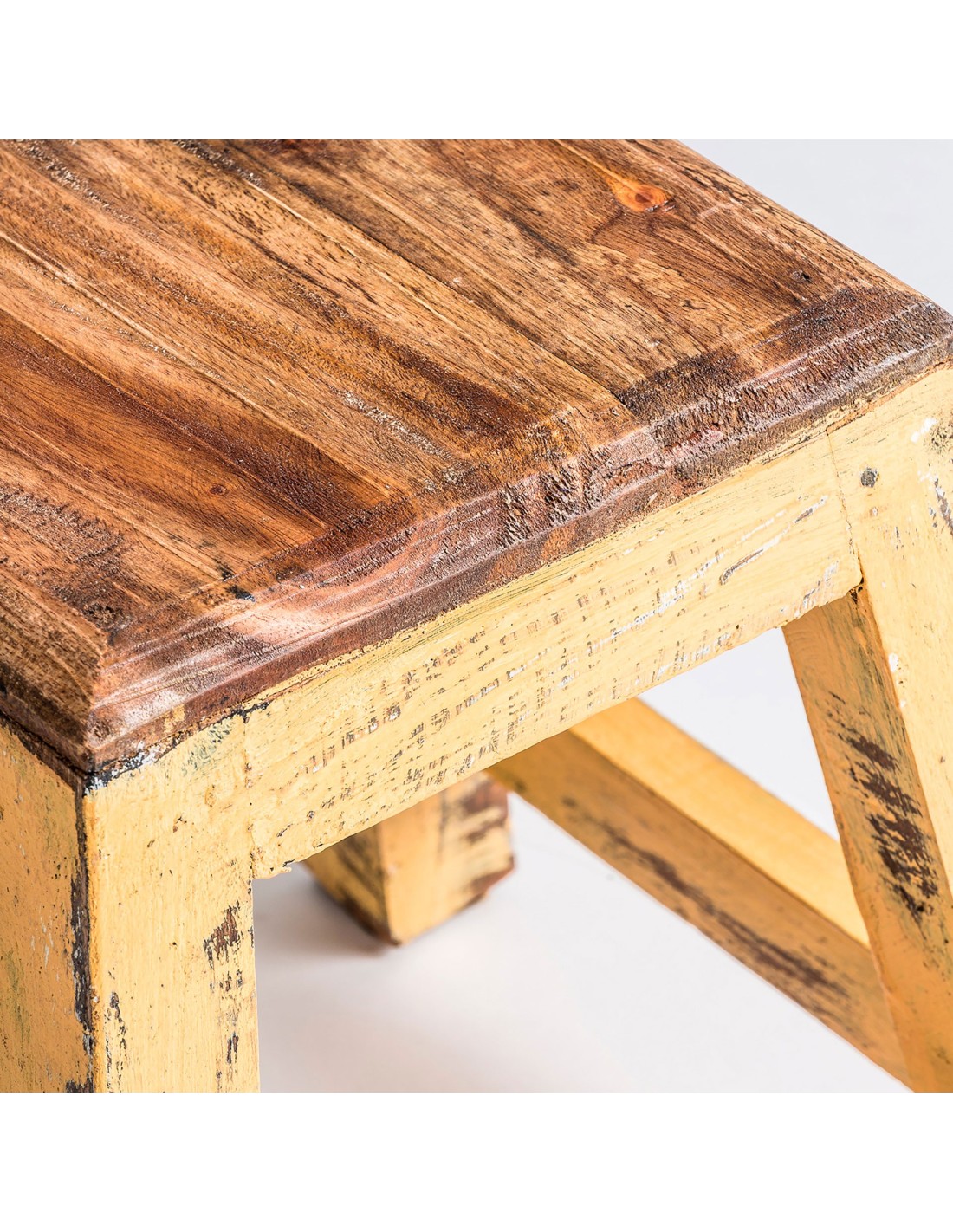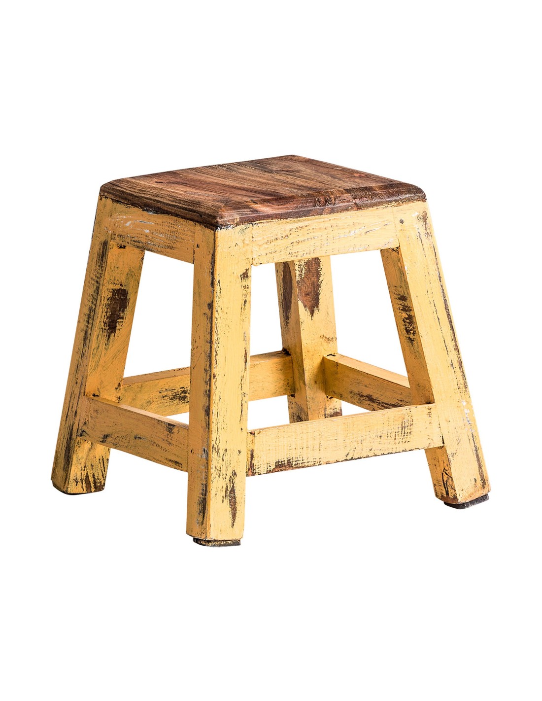 Reposapiés cuadrado Buzet de estilo Kitsch, fabricado en madera de caoba en color mostaza con acabado decapado.