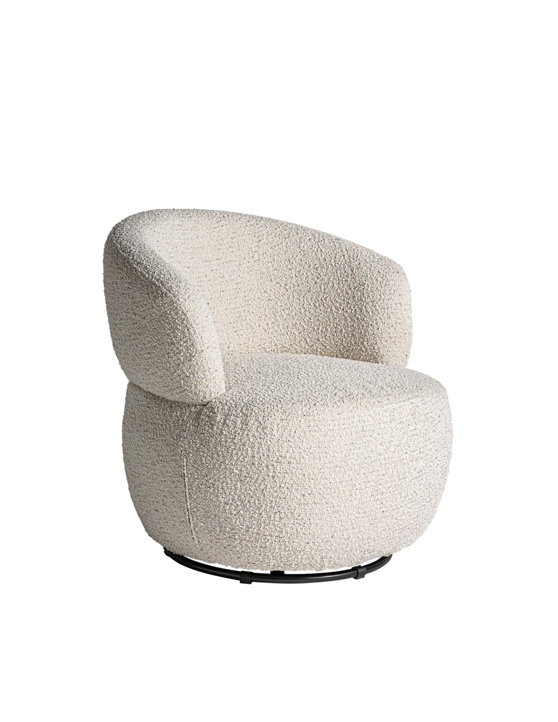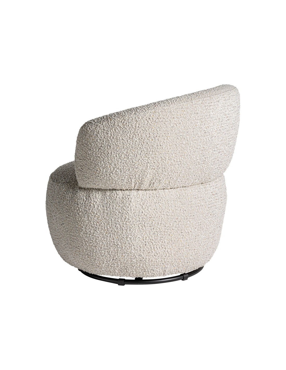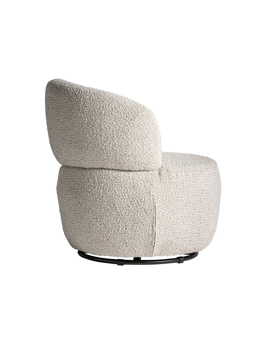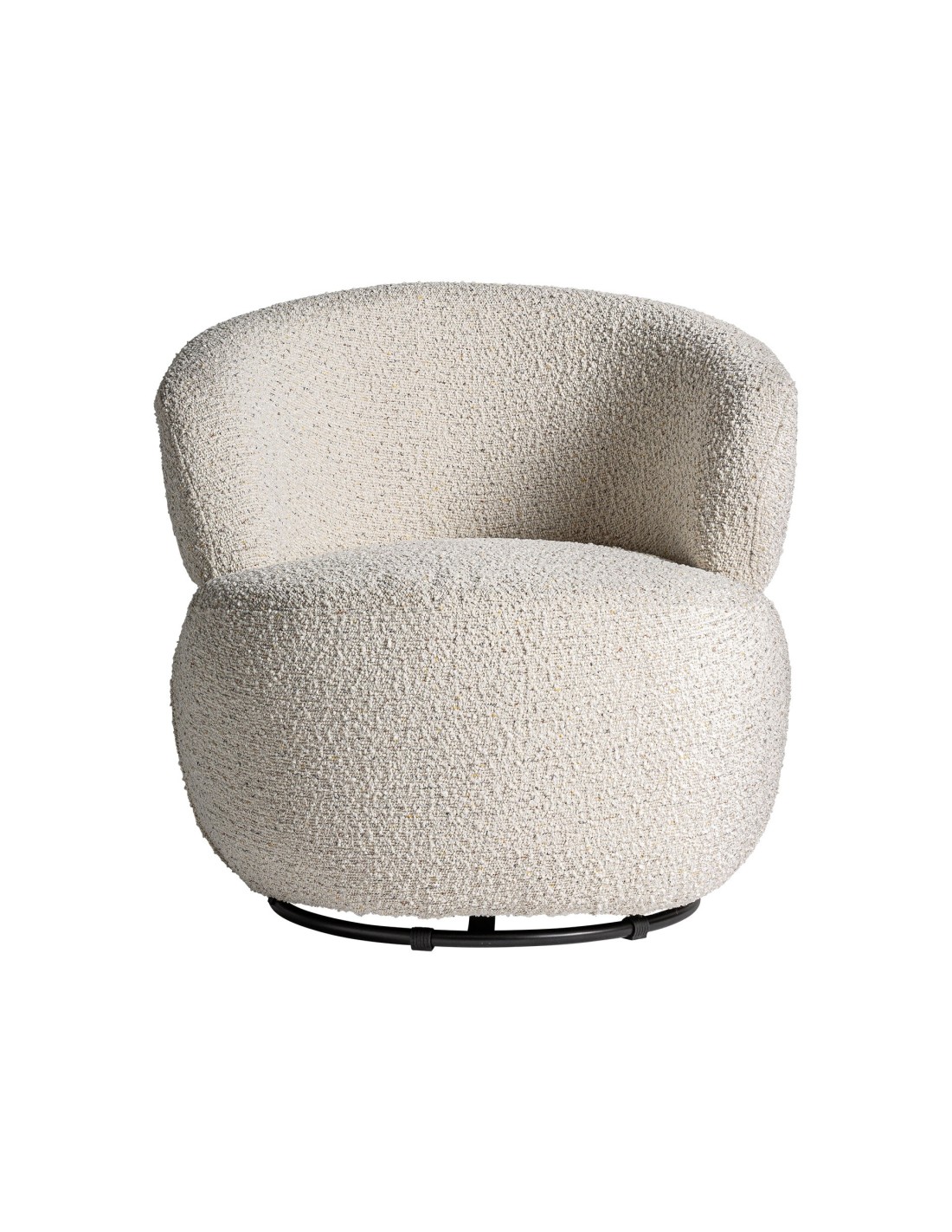 Sillón giratorio redondo Vayres de estilo Contemporáneo, fabricado en algodón bouclé en color blanco roto, hierro en color negro y madera de caucho.