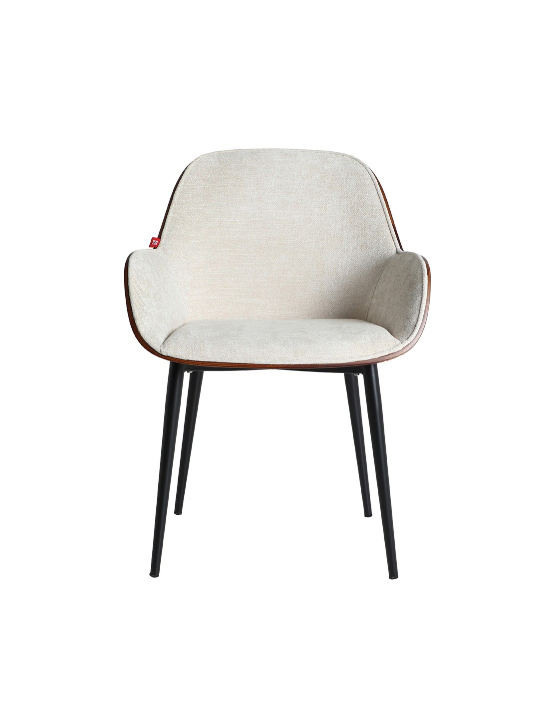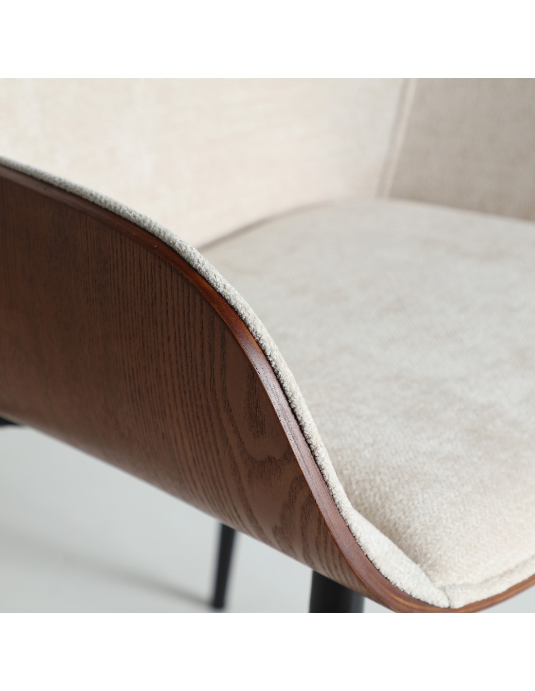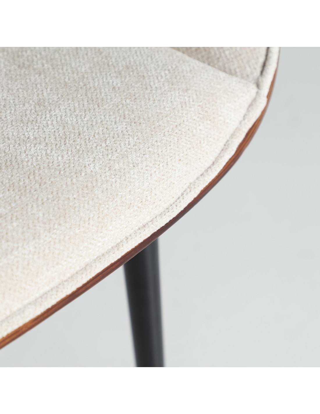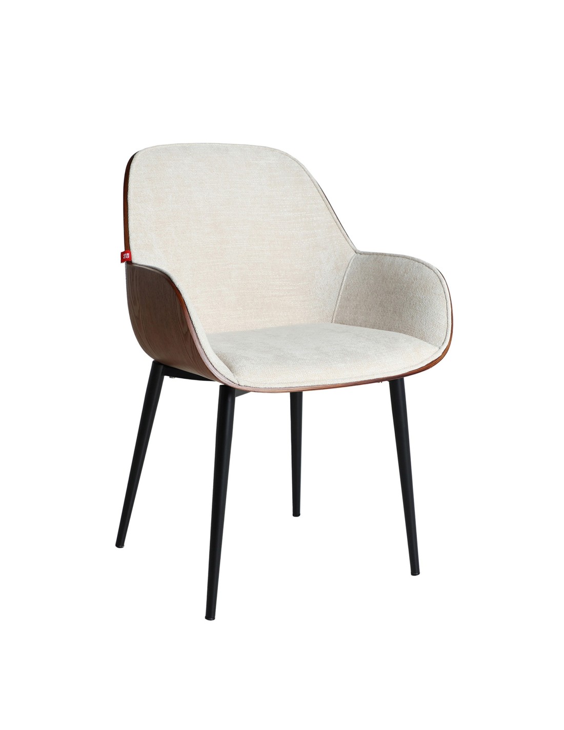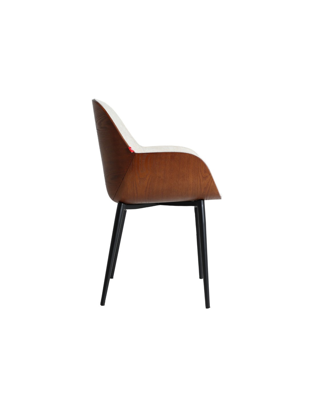 Silla Beesd de estilo Moderno, fabricada en madera contrachapada en color marrón, poliéster en color blanco roto y aluminio en color negro.