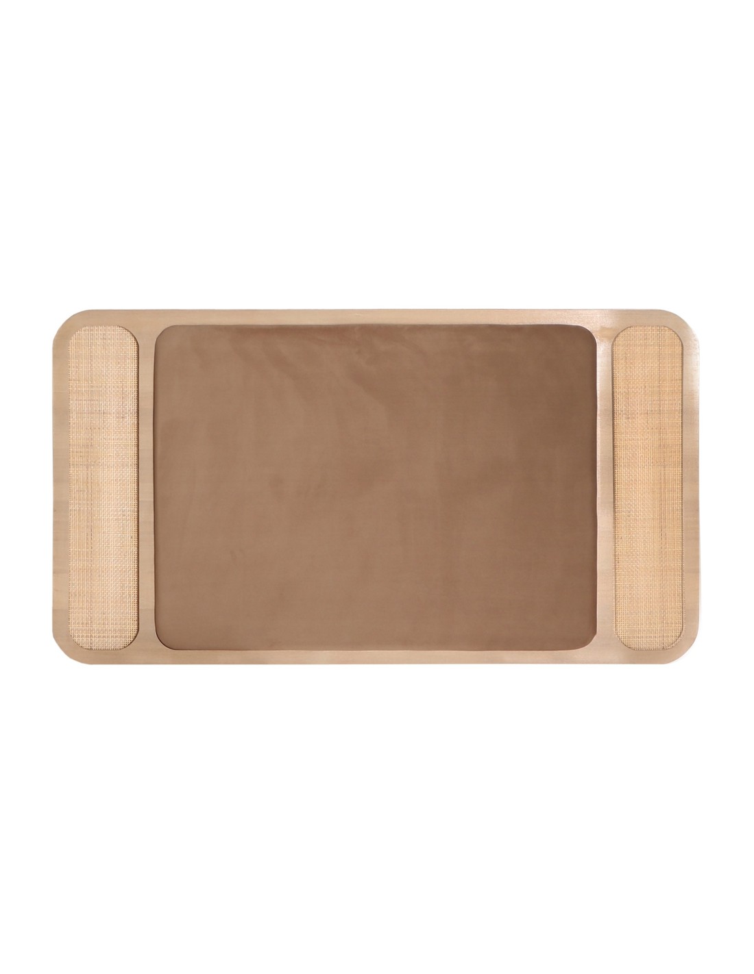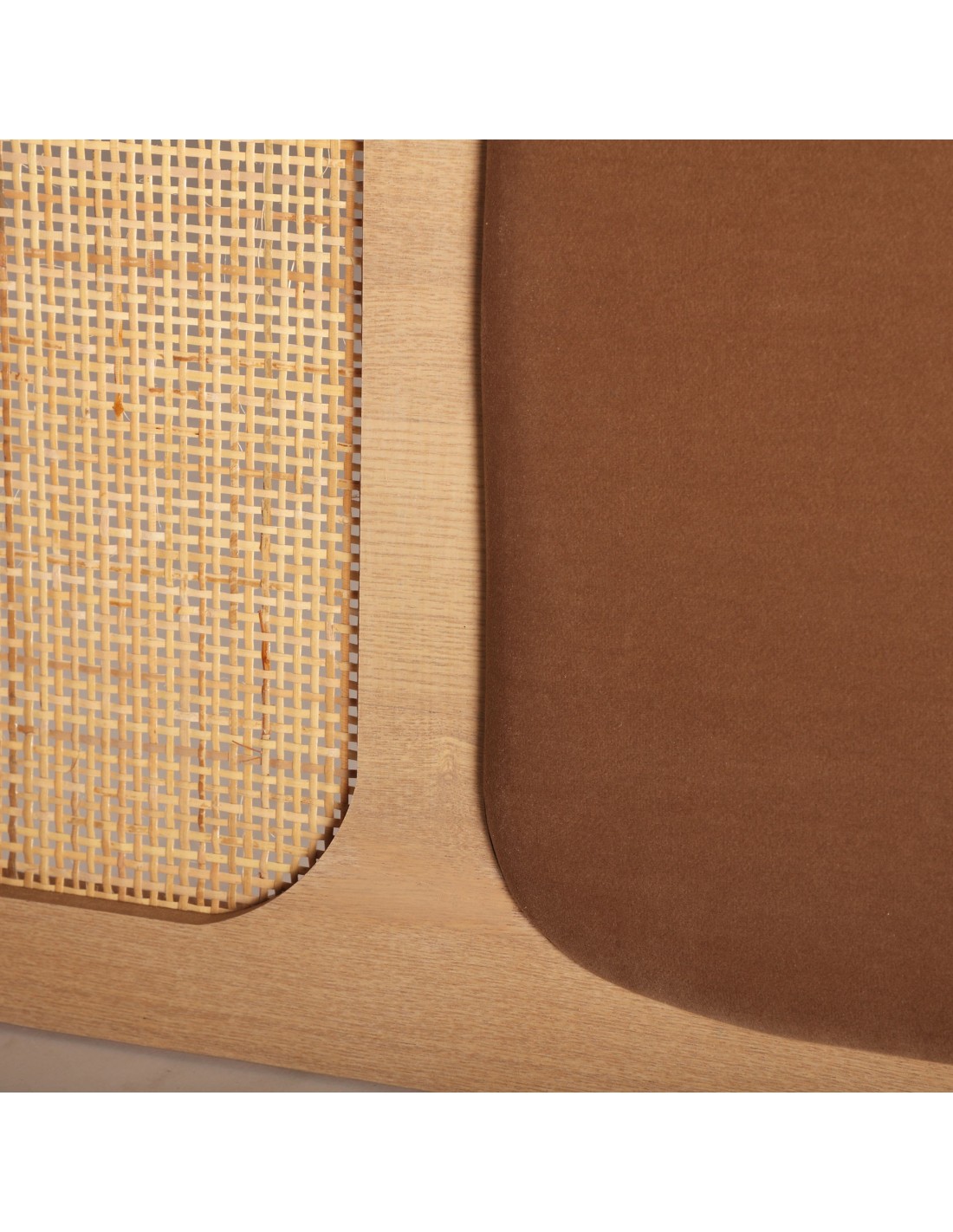 Cabecero de cama rectangular Larvik de estilo Nórdico, fabricado en madera de pino en color marrón, ratán marrón claro y tapizado de terciopelo en color camel.