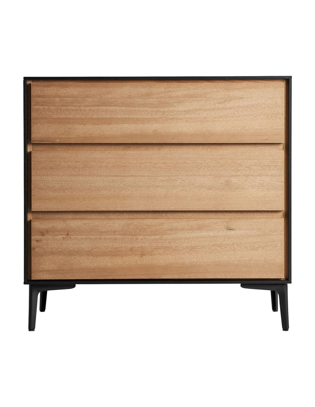 Cómoda cuadrada Brussa de estilo Nórdico, fabricada en DM en color marrón claro y hierro en color negro. Producto desmontable.