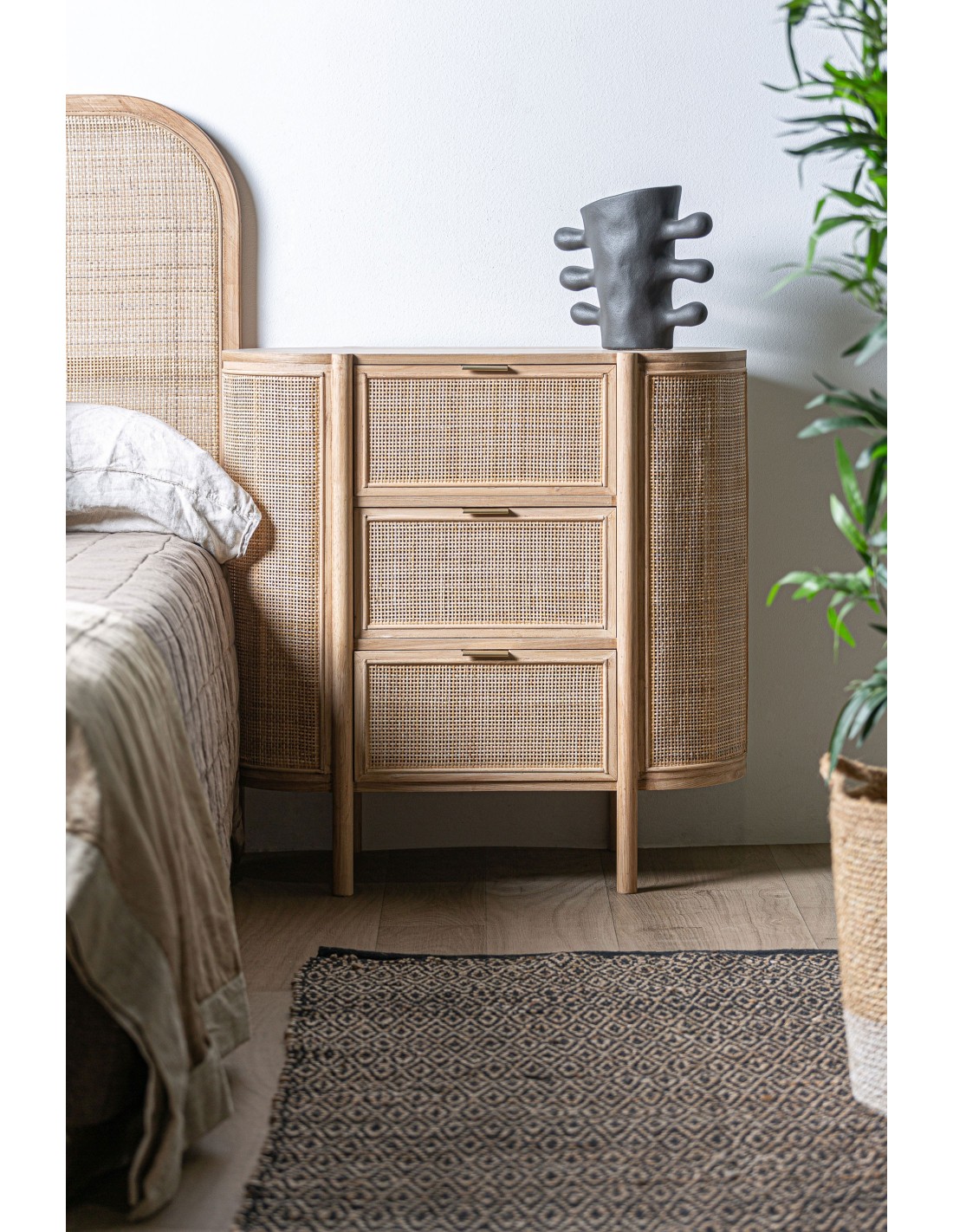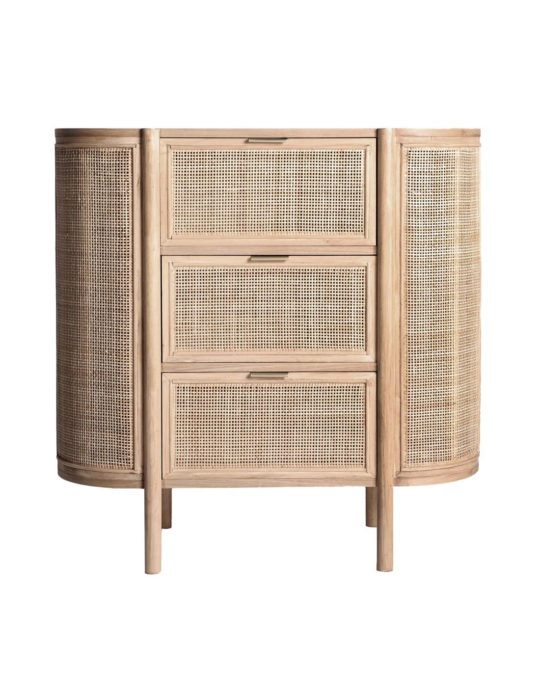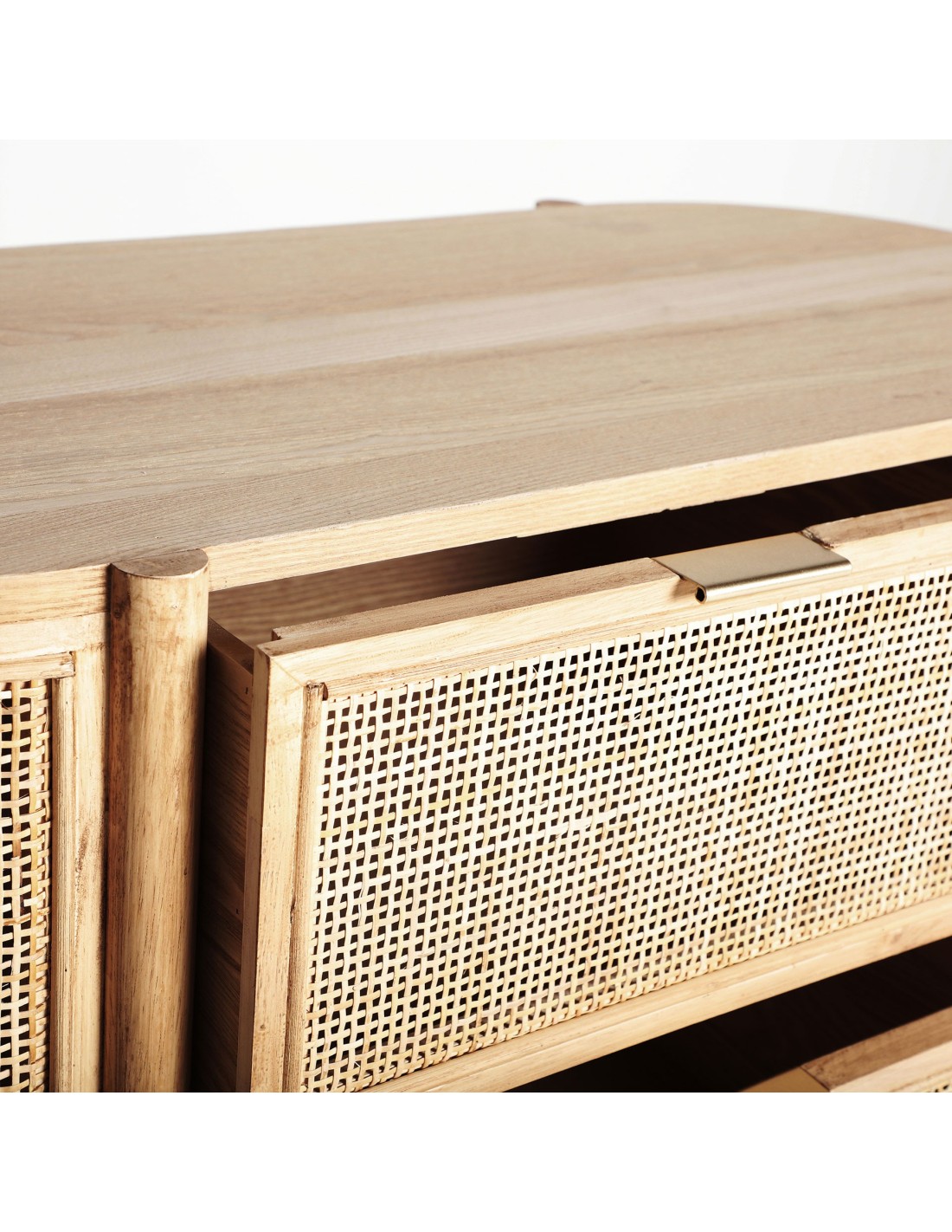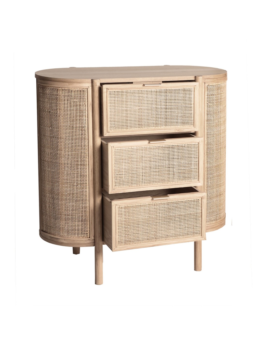 Cómoda oval Ikla de estilo Nórdico, fabricada en DM en color marrón, madera de fresno y ratán.