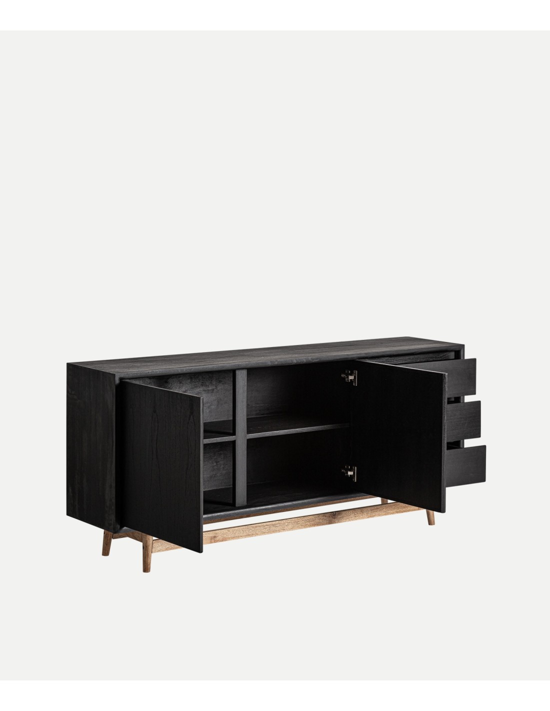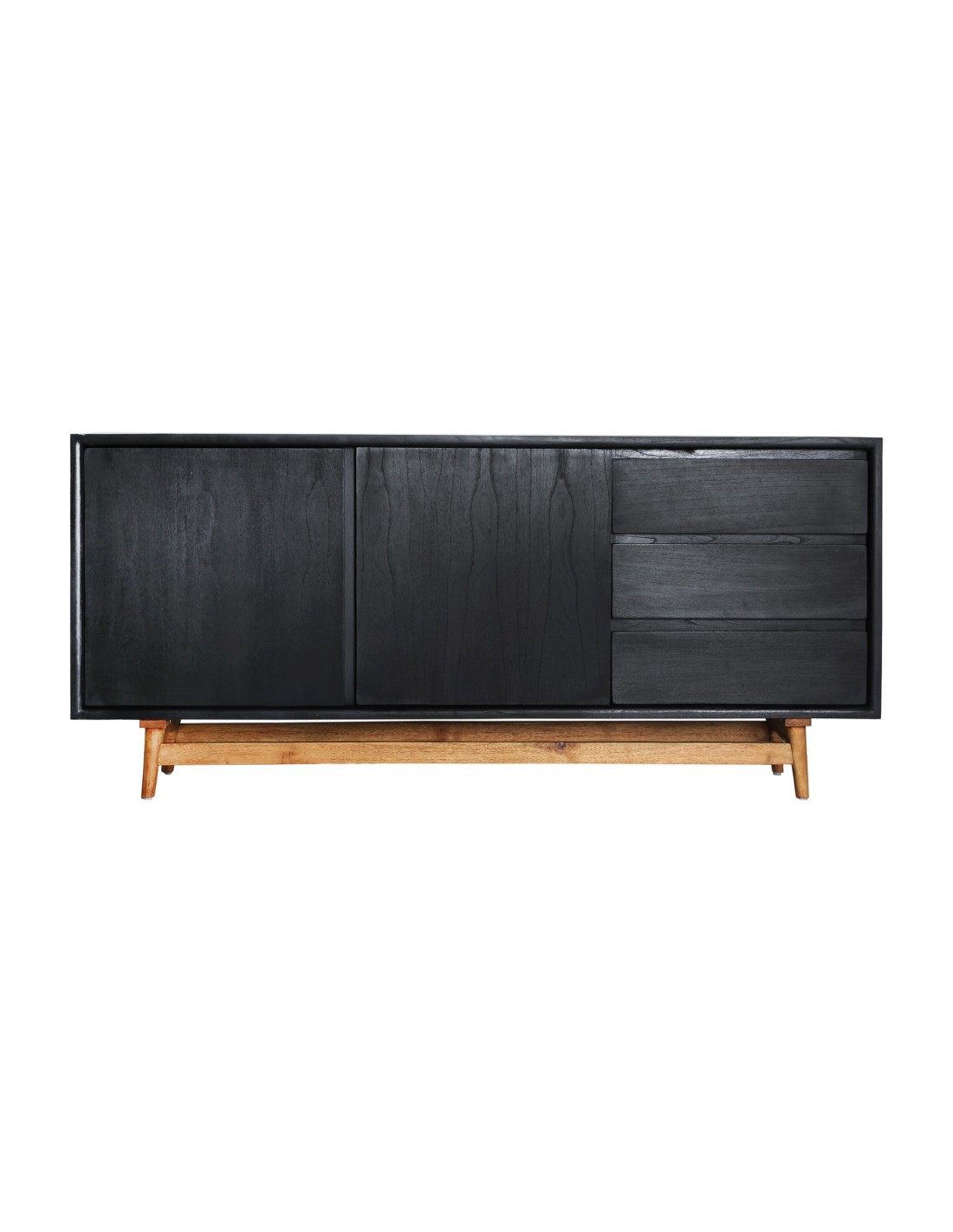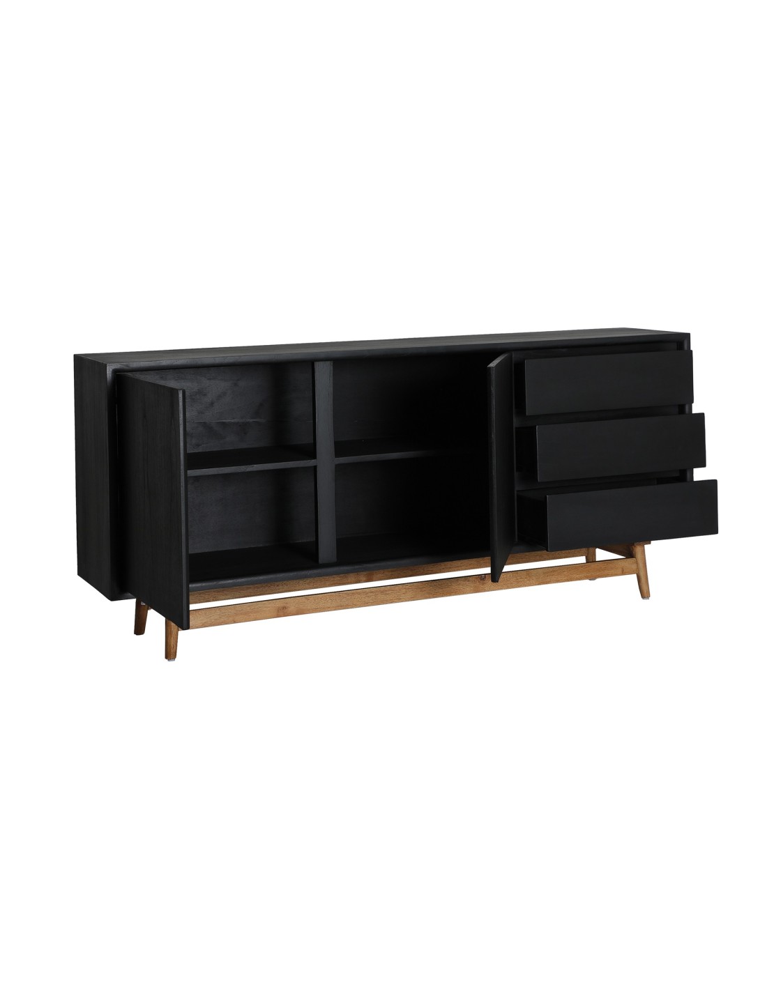 Aparador Thiers de estilo Nórdico, fabricado en madera de mindi en color negro y madera contrachapada en color marrón. Producto desmontable.