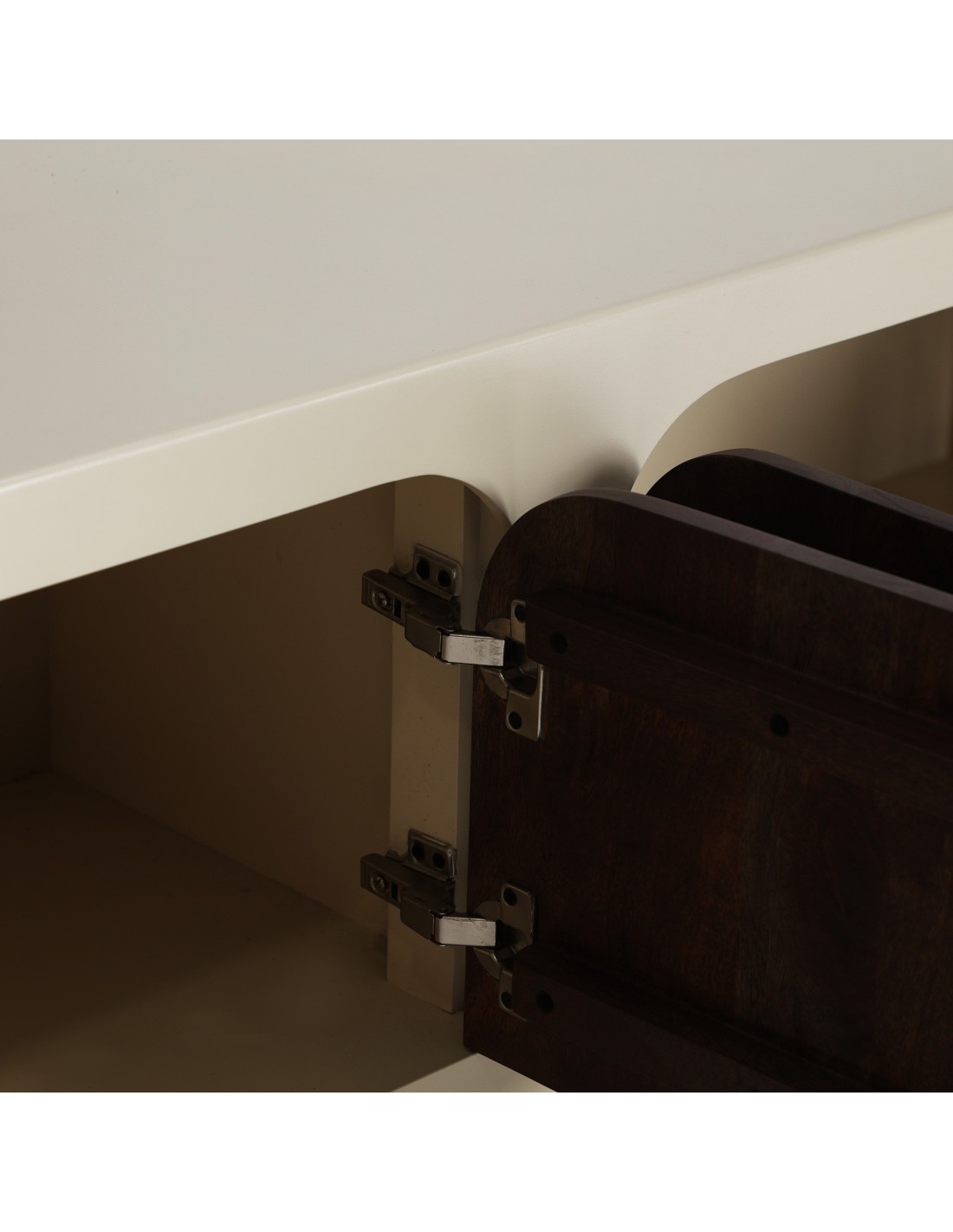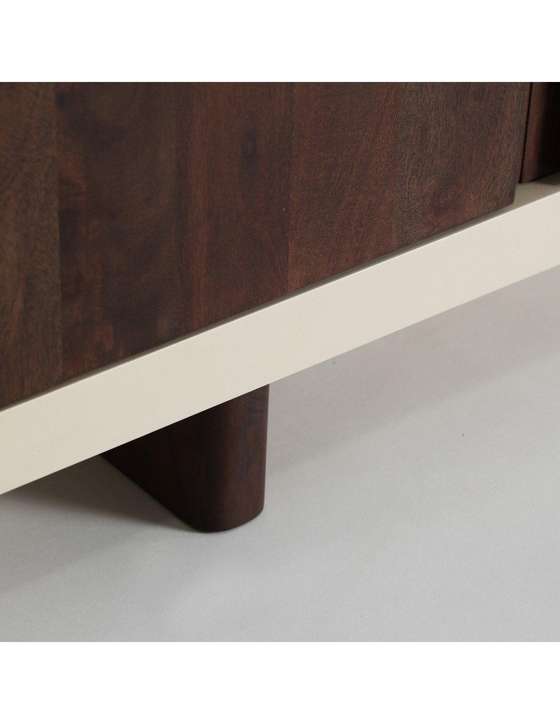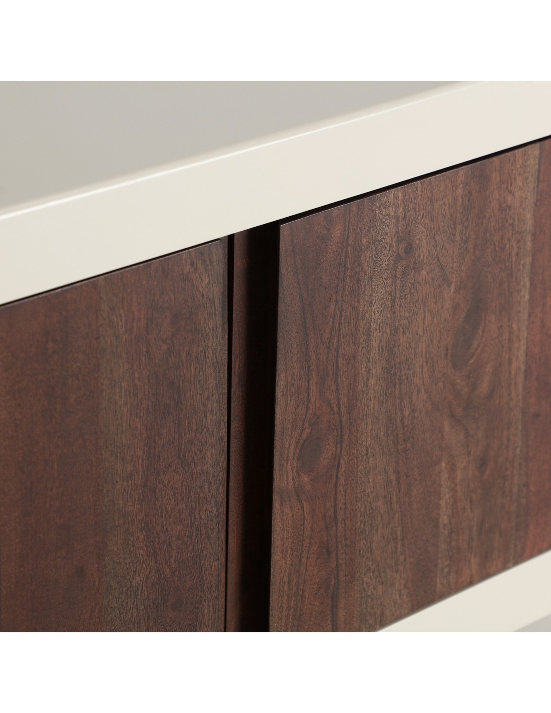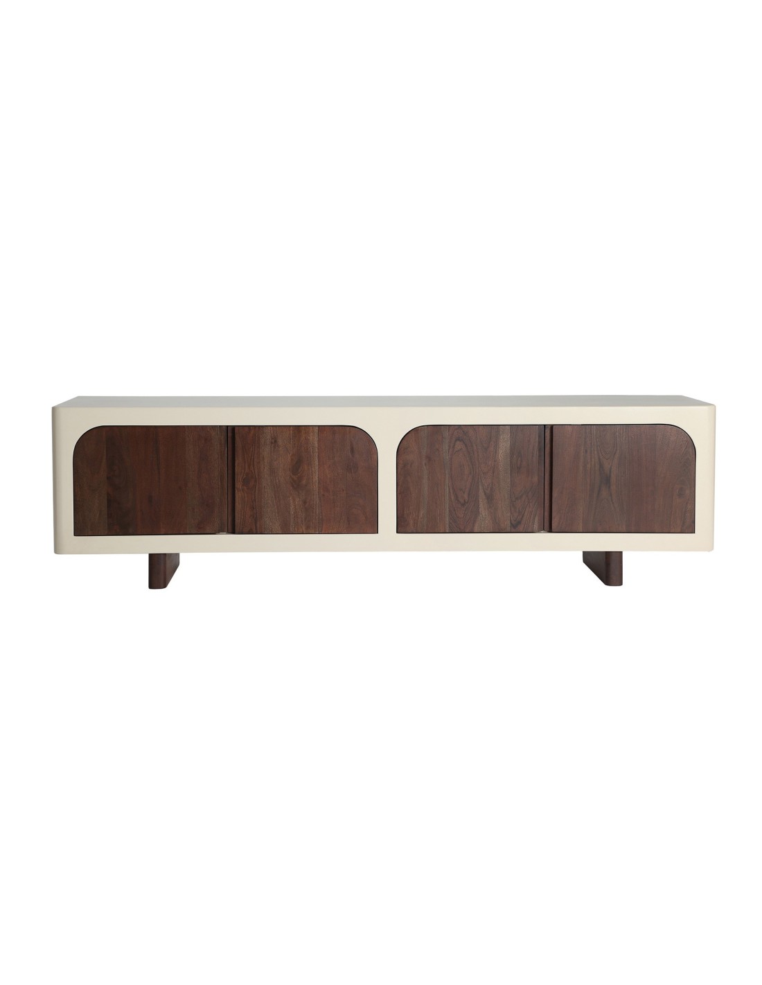 Mueble para TV Glaris de estilo Contemporáneo, fabricado en madera de acacia en color blanco roto y DM en color marrón. Producto desmontable.