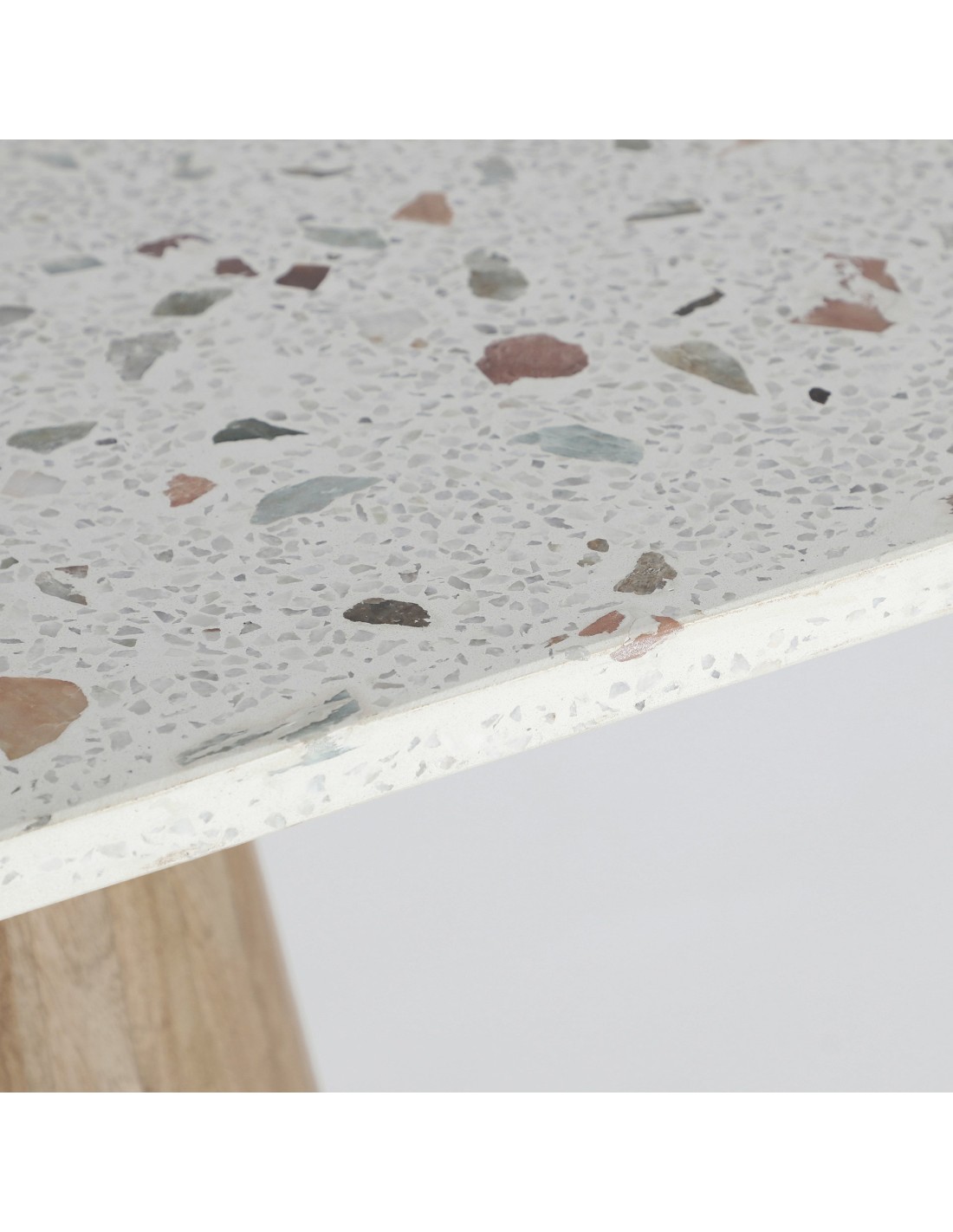 Mesa bar Lautrec de estilo Nórdico, fabricada en terrazo en color blanco y madera de mango en color marrón.