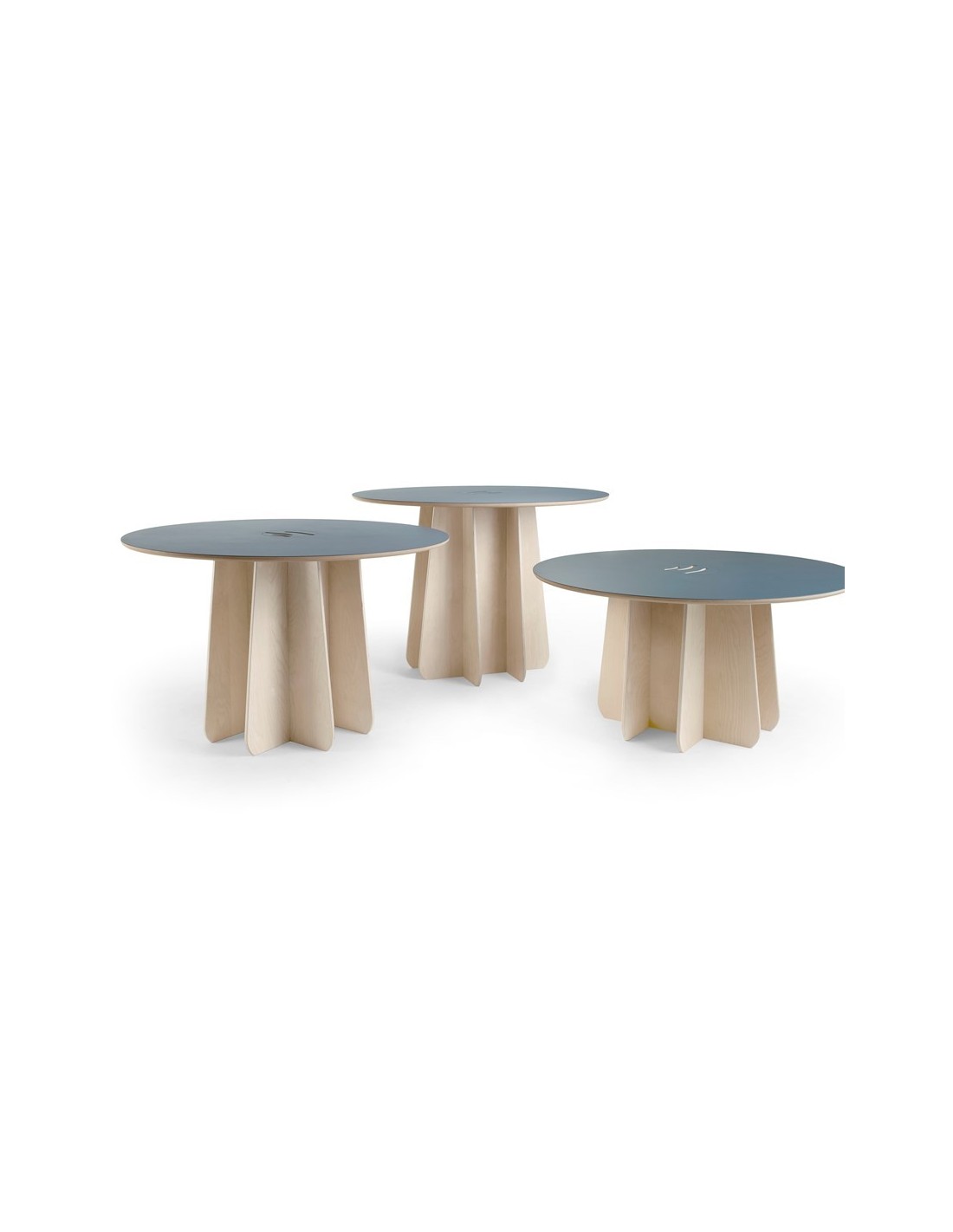 La colección de mesas Funghi se caracteriza por una identidad de diseño clara, con estructuras de pedestal autoensamblables sin materiales añadidos. Todos sus modelos están fabricados íntegramente en madera y presentan emisiones muy bajas, lo que contribuye a un impacto ambiental reducido.