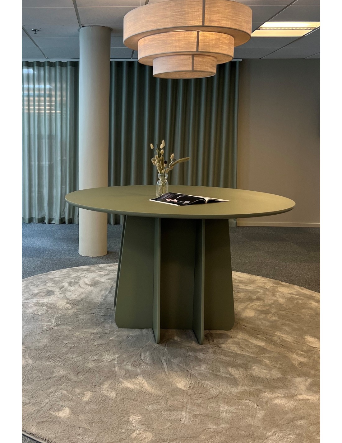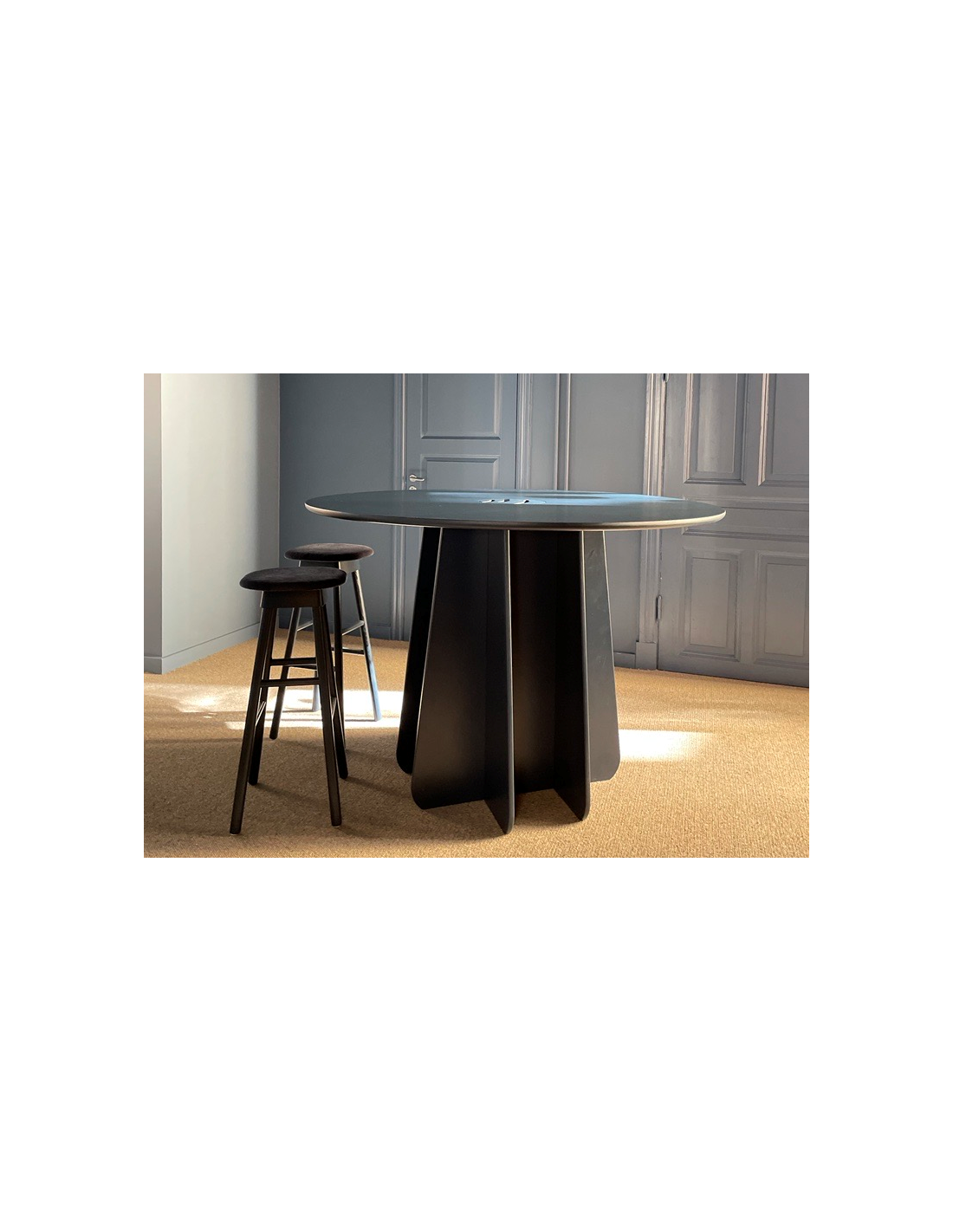 Con un diámetro de tablero de 120 cm, la mesa de comedor Funghi Tondo es ideal para cinco comensales. Su columna central está compuesta por cuatro discos autoensamblables de contrachapado de abedul torneado y puede personalizarse fácilmente en otro color, al igual que pueden adaptarse el tamaño y los materiales de superficie (linoleum, laminado HP, Fenix, Artigo Kayar, chapa de fresno o roble apta para reacondicionamiento).