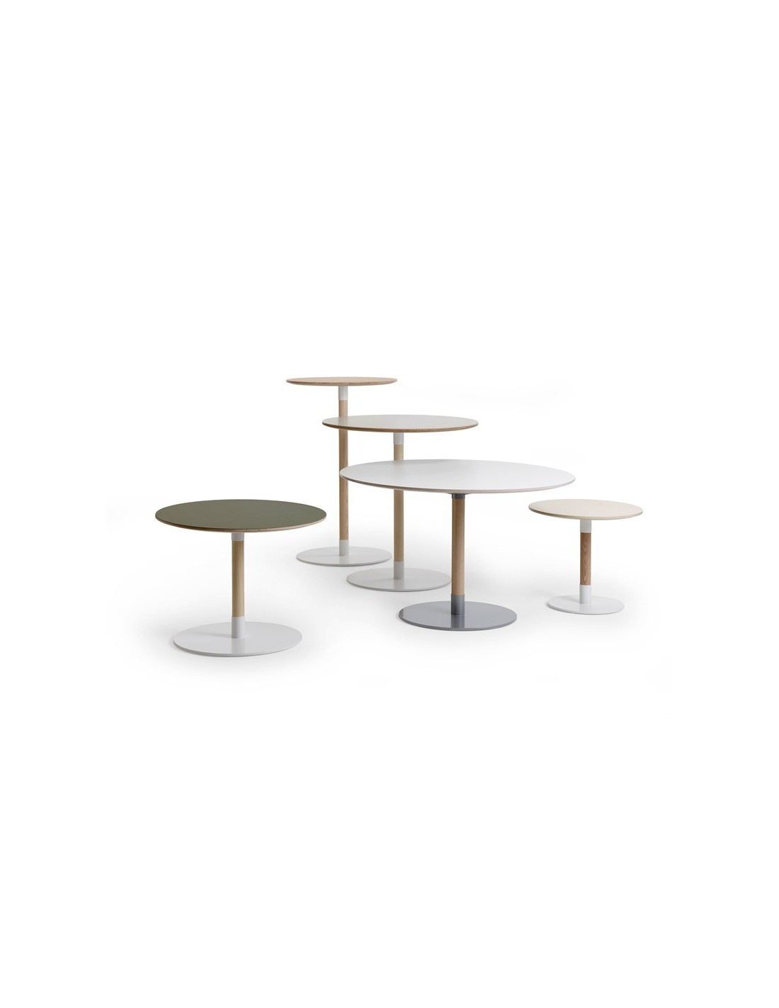 La colección de mesas John es una familia de mesas con columna de madera maciza y base redonda de metal, diseñada por Formforyou. El canto visto y biselado de contrachapado del tablero de Ø90 cm y su base redonda y elegante en metal blanco (RAL 9003), le proporcionan una apariencia ligera y estilizada, al tiempo que se integra de forma armoniosa con el suelo. La mesa John es flexible y puede personalizarse en distintas alturas y colores, así como en especie de madera, dimensiones y materiales de superficie (linoleum, laminado HP, Fenix, Artigo Kayar, chapa de fresno o roble apta para reacondicionamiento.