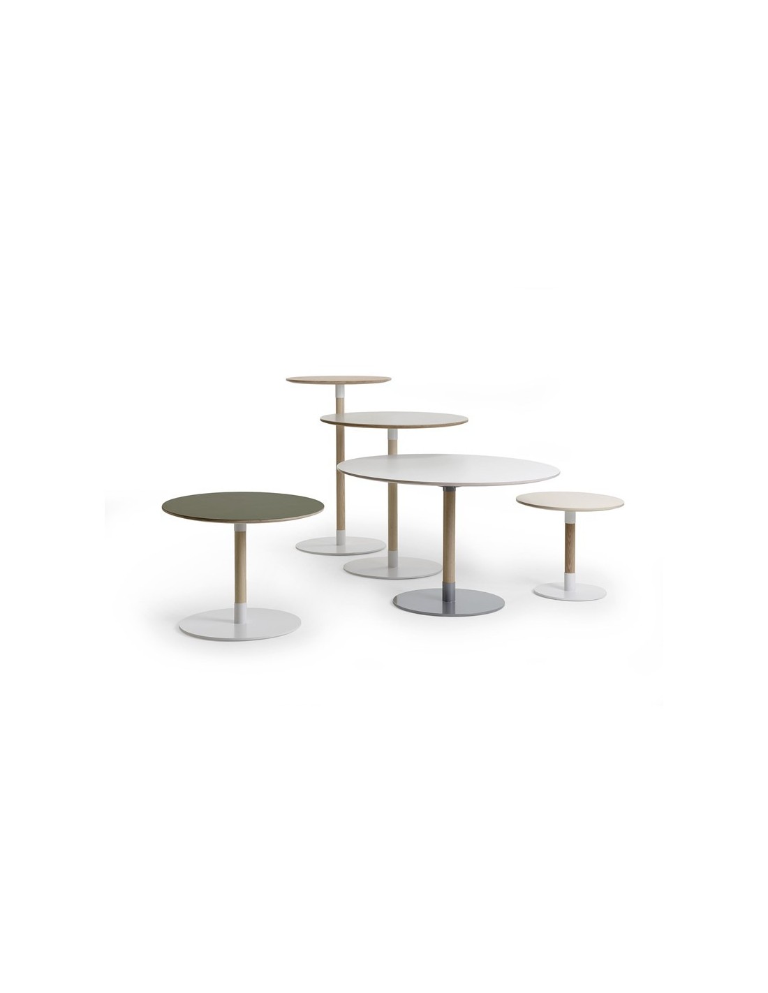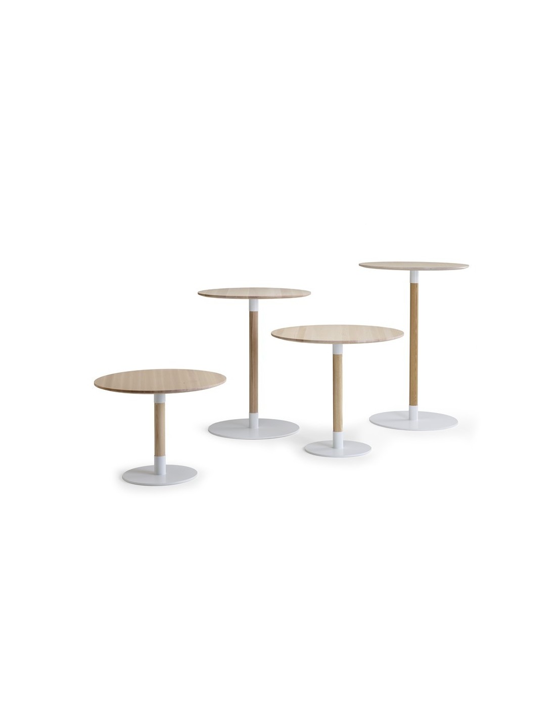 La colección de mesas John es una familia de mesas con columna de madera maciza y base redonda de metal, diseñada por Formforyou. El canto visto y biselado de contrachapado del tablero de Ø80 cm y su base redonda y elegante en metal blanco (RAL 9003), le proporcionan una apariencia ligera y estilizada, al tiempo que se integra de forma armoniosa con el suelo. La mesa John es flexible y puede personalizarse en distintas alturas y colores, así como en especie de madera, dimensiones y materiales de superficie (linoleum, laminado HP, Fenix, Artigo Kayar, chapa de fresno o roble apta para reacondicionamiento.