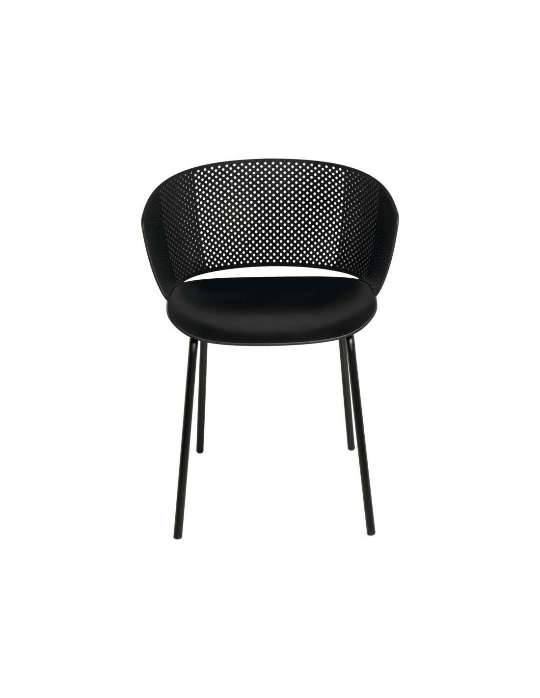 Silla con brazos estilo contemporáneo, con patas tubulares en metal pintado negro y asiento con patrón de círculos troquelados en polipropileno a tono con las patas.