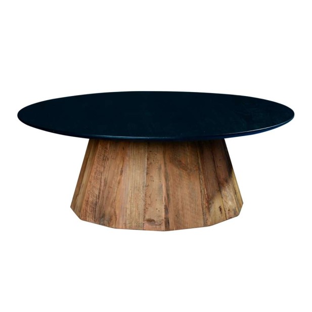 Mesa baja redonda, con diseño estilo nórdico, de fabricación 100% artesanal. Cuenta con base de madera natural reciclada y sobre biselado de madera contrachapada acabado pintura negra.