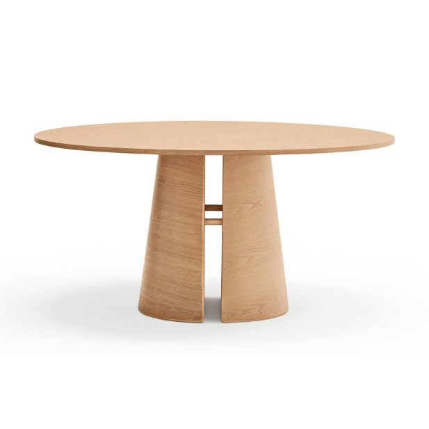 Mesa de comedor redonda, elaborada en su totalidad en DM y madera de fresno acabado natural. Diseño minimalista, con base cónica, compuesta por dos piezas simétricas y sobre circular. Una pieza que destaca por sus formas equilibradas y detallado trabajo sobre la madera. Exclusivo de la marca Teulat.