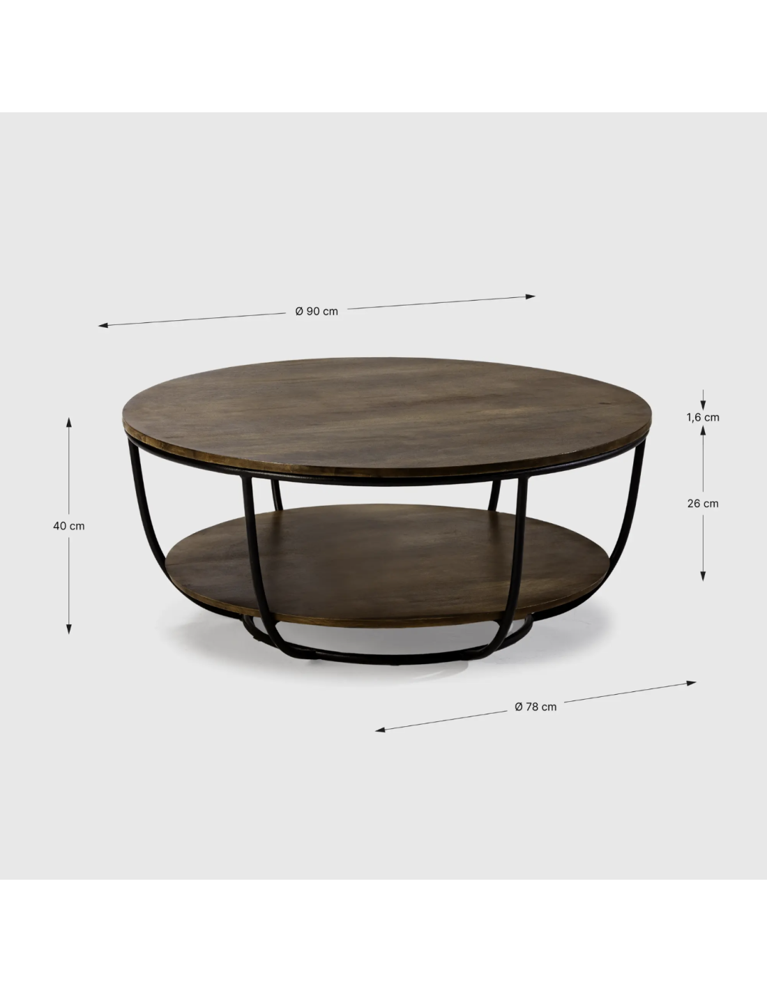 Mesa de centro redonda con estructura tubular en metal y sobre y un estante elaborados en madera maciza de mango proveniente de la lndia.