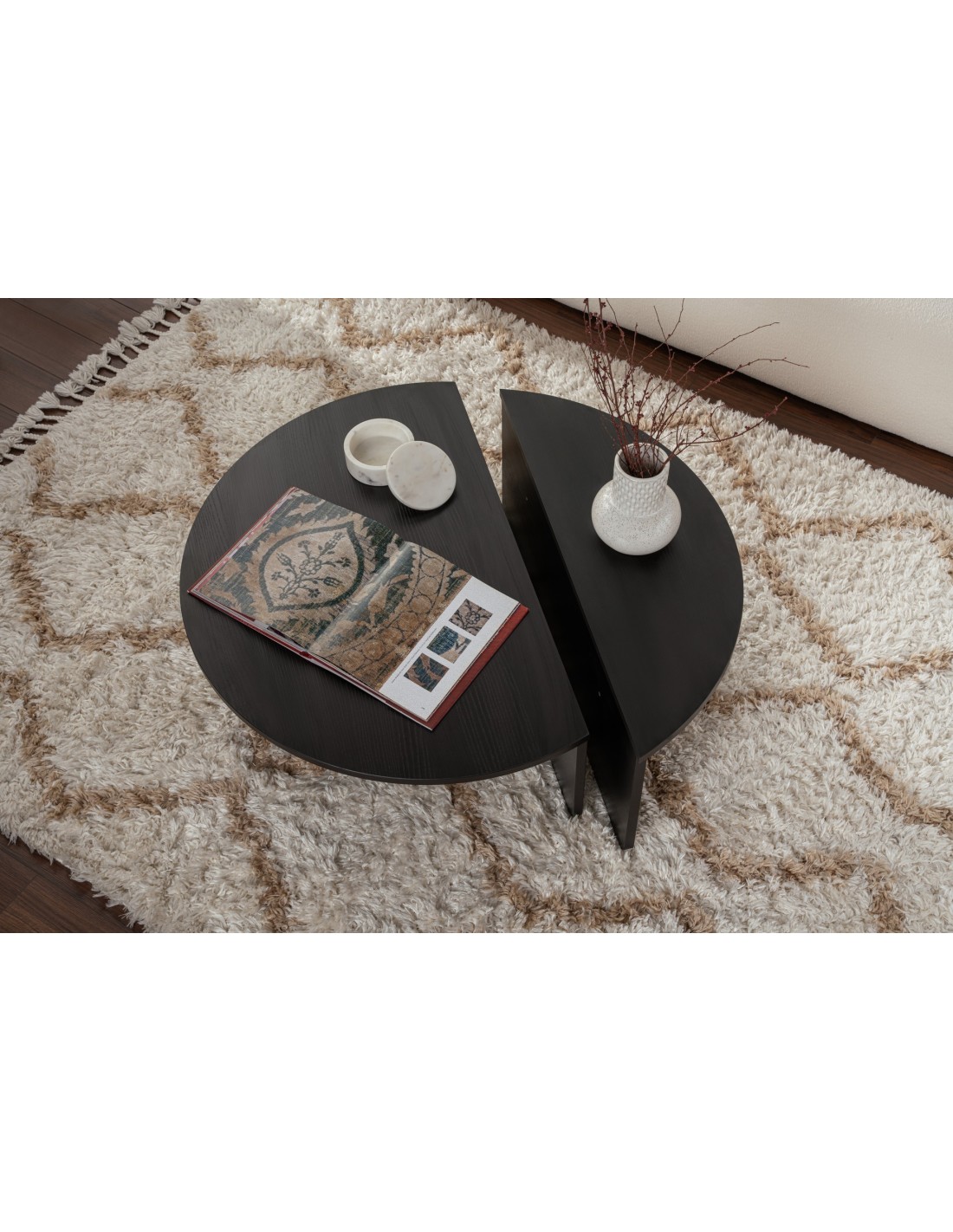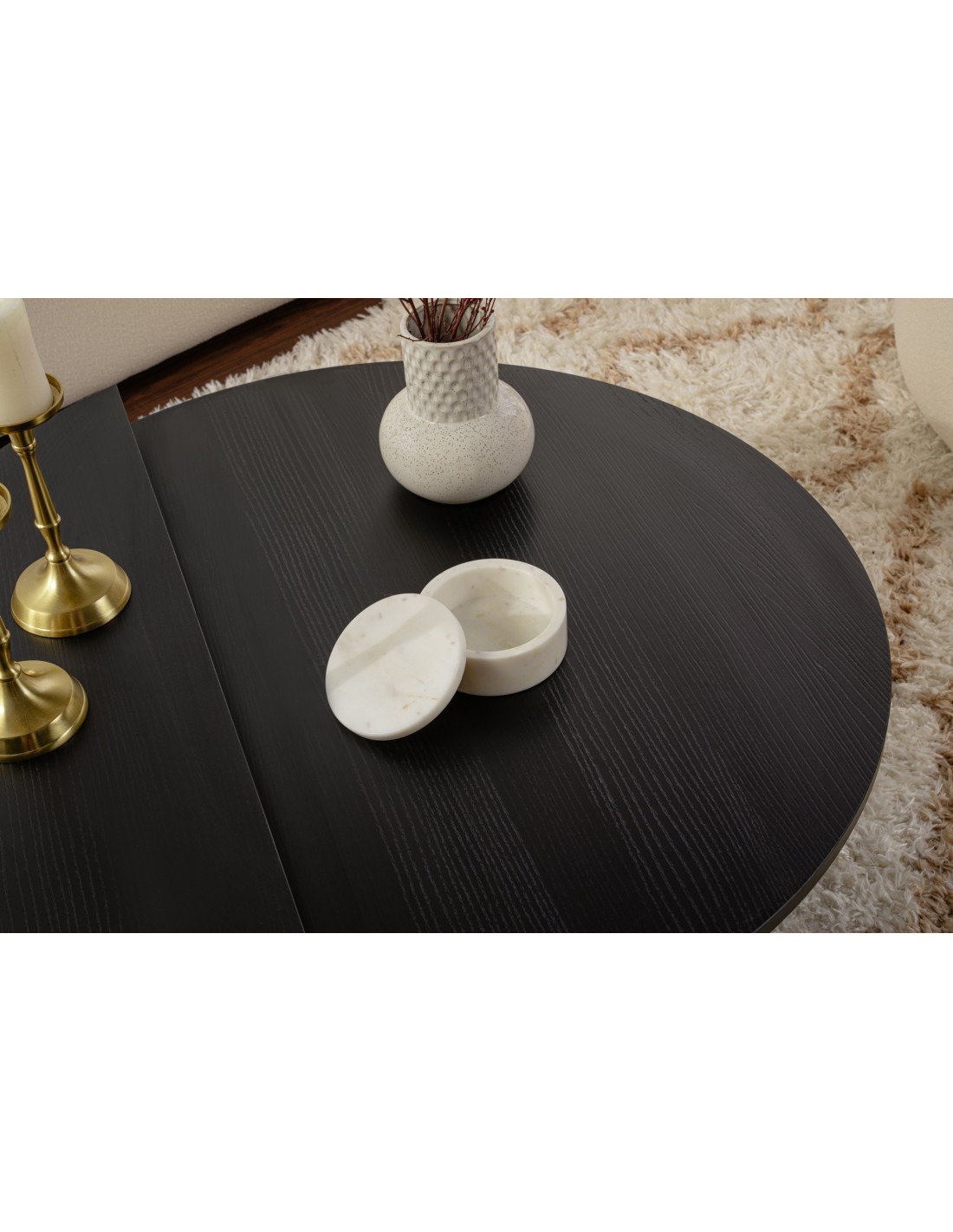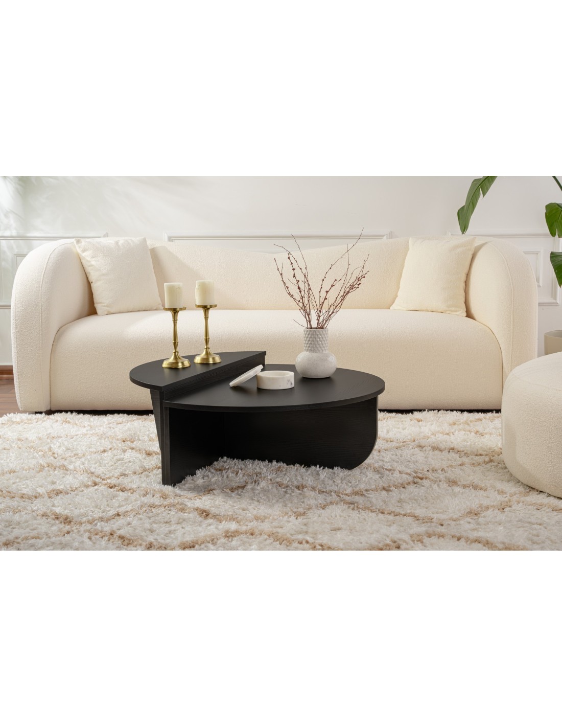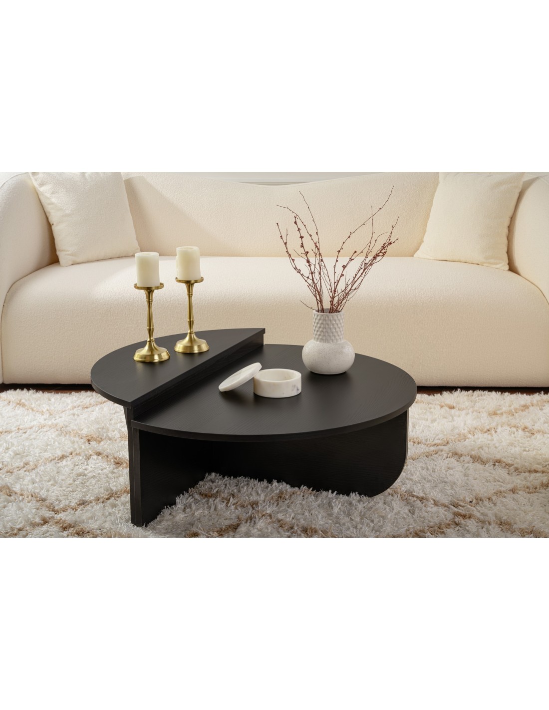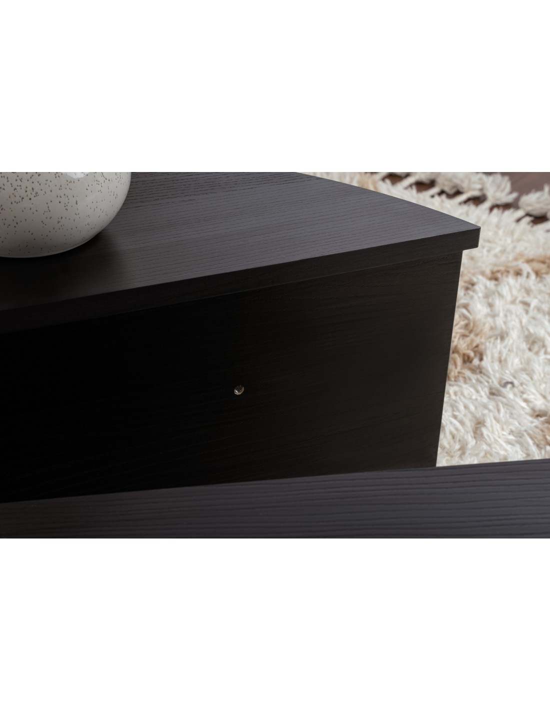 El rico acabado negro madera de esta mesa de centro añade calidez y profundidad a cualquier habitación, creando una atmósfera acogedora perfecta para relajarse o entretener a los invitados. Su diseño elegante y líneas limpias la convierten en una pieza versátil que puede complementar fácilmente cualquier estilo decorativo, ya sea moderno o tradicional.