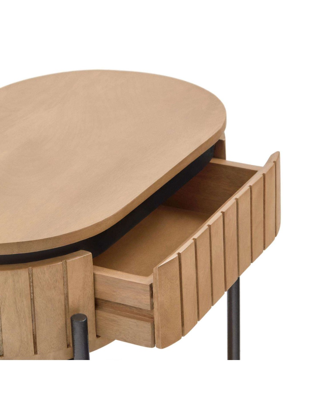 Licia es un diseño del equipo de Kave Home hecho artesanalmente con piezas de madera maciza de mango sostenible, colocadas individualmente una a una para crear sus formas redondeadas. La tendencia que aporta movimiento y fluidez a tus interiores.Mesita de noche LICIA 1 cajón 55 x 65 cm mango/metal negro - Kave Home