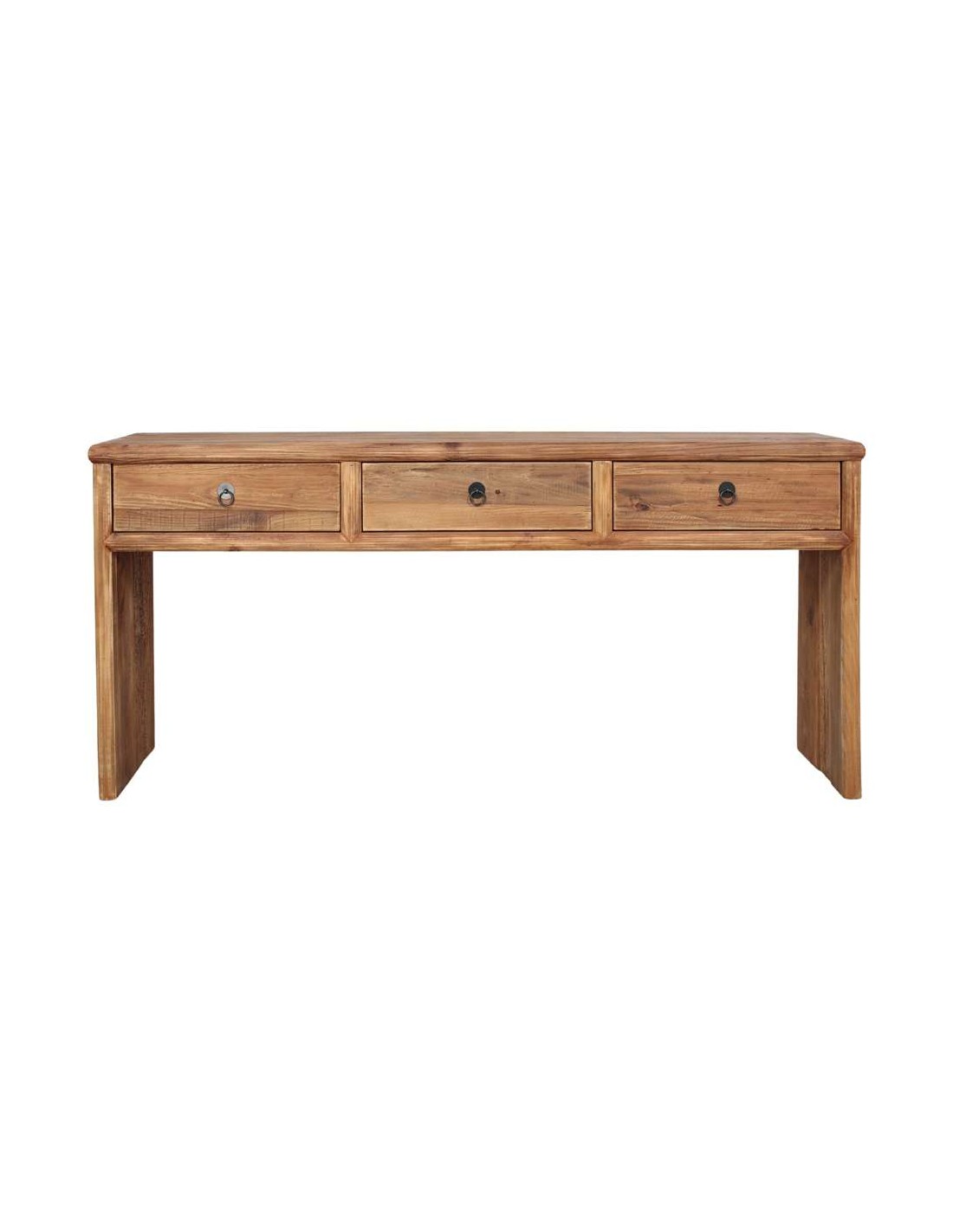 Consola estilo Rústico con sistema de tres cajones frontales, elaborada en su totalidad en madera de pino reciclada acabado natural. Una pieza ideal para dar un toque cálido y acogedor a la entrada de cualquier espacio, ya sea en el hogar, la oficina o en locales de hostelería.