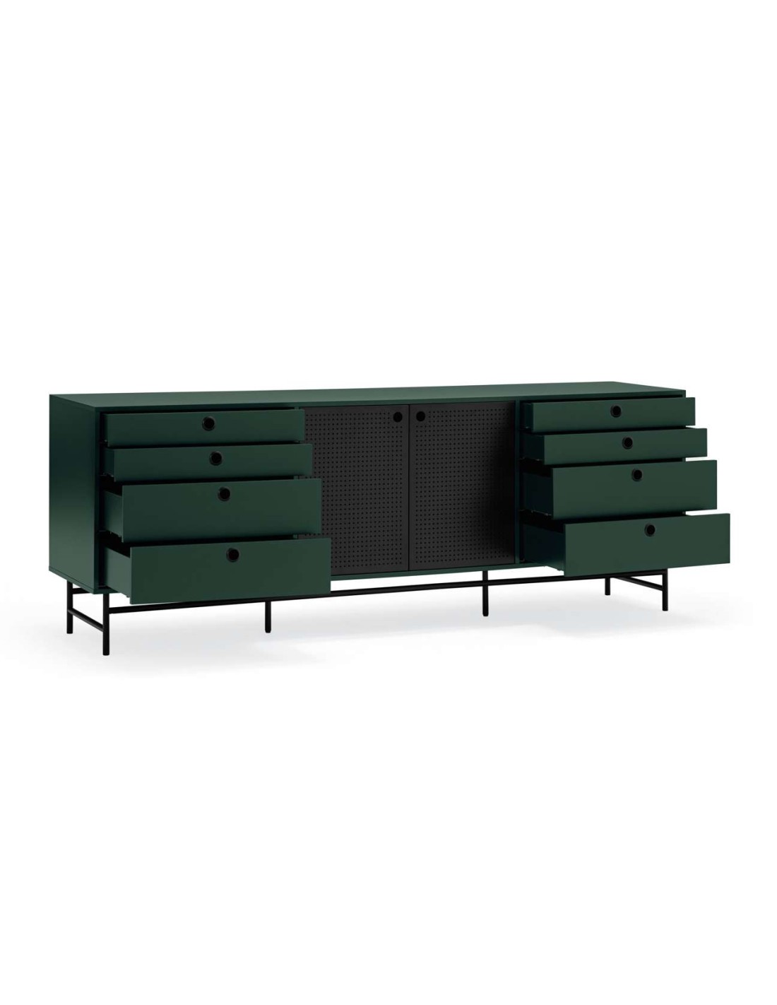 Aparador de gran formato con casco elaborado en DM lacado verde oscuro, dos puertas metálicas perforadas en acabado negro, con tirador circular integrado y ocho cajones. Una pieza altamente funcional, que rescata la estética del vanguardismo industrial, para adaptarla a los interiores más actuales. Diseño exclusivo de la marca Teulat.