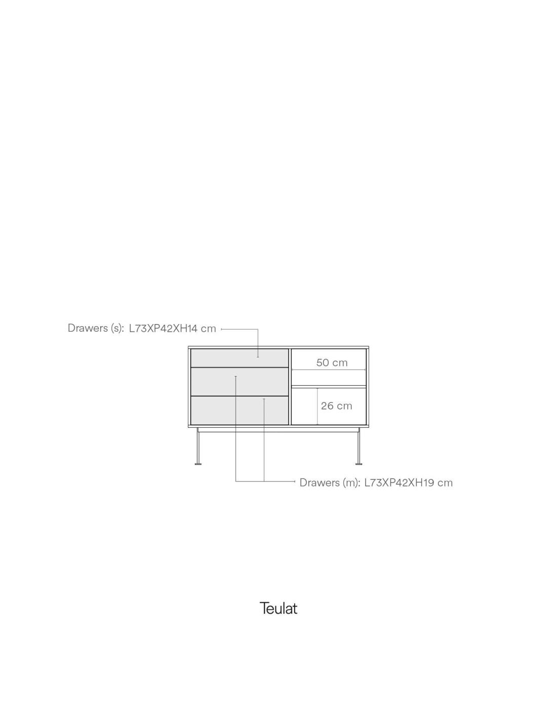 Aparador elaborado en chapa de roble y DM lacado crema con patas de metal a tono. Cuenta con tres cajones y un compartimiento con puerta con un estante interior. Una solución de almacenaje funcional y versátil, que se adapta fácilmente a las necesidades de cualquier hogar. Diseño contemporáneo exclusivo de la marca Teulat.
