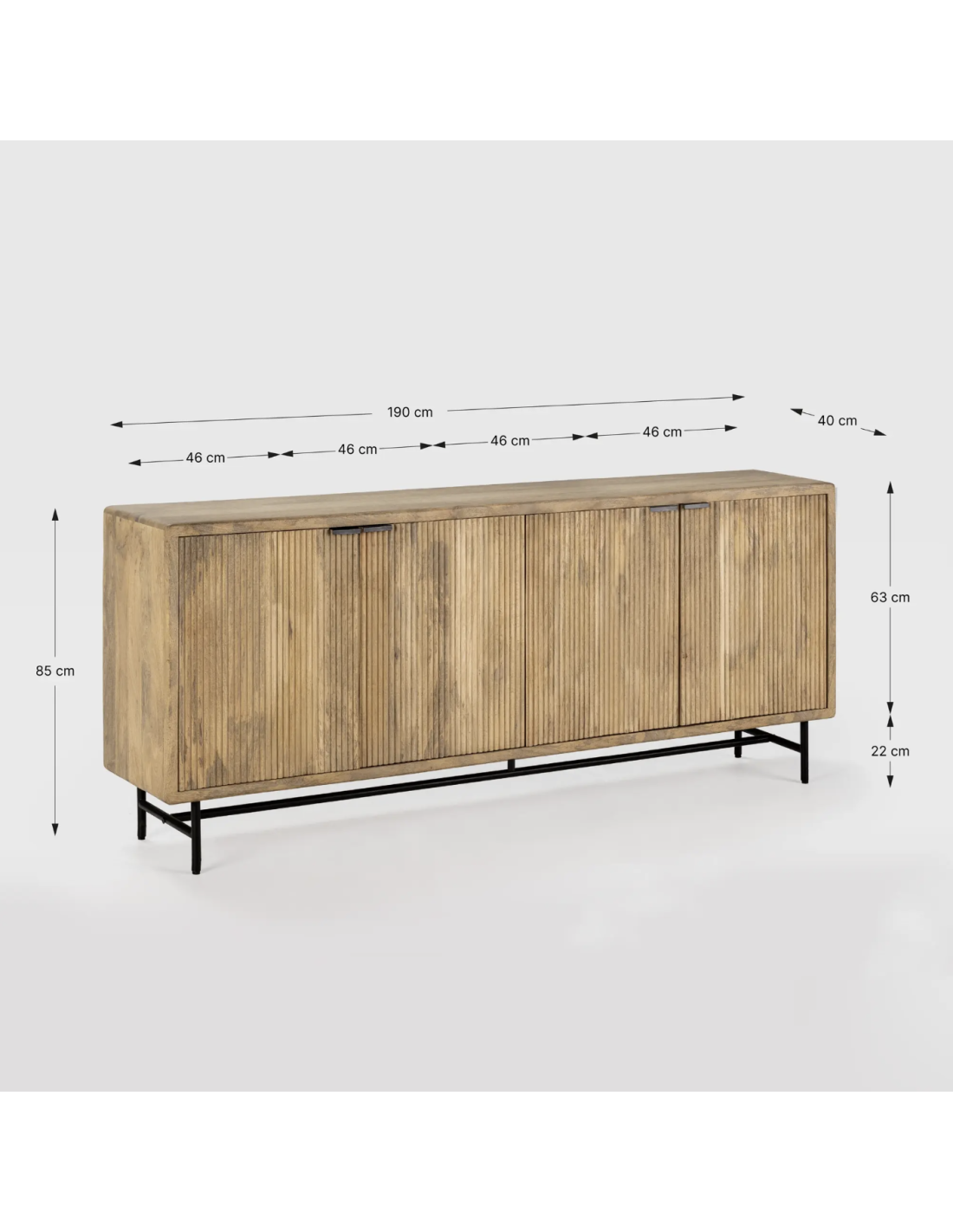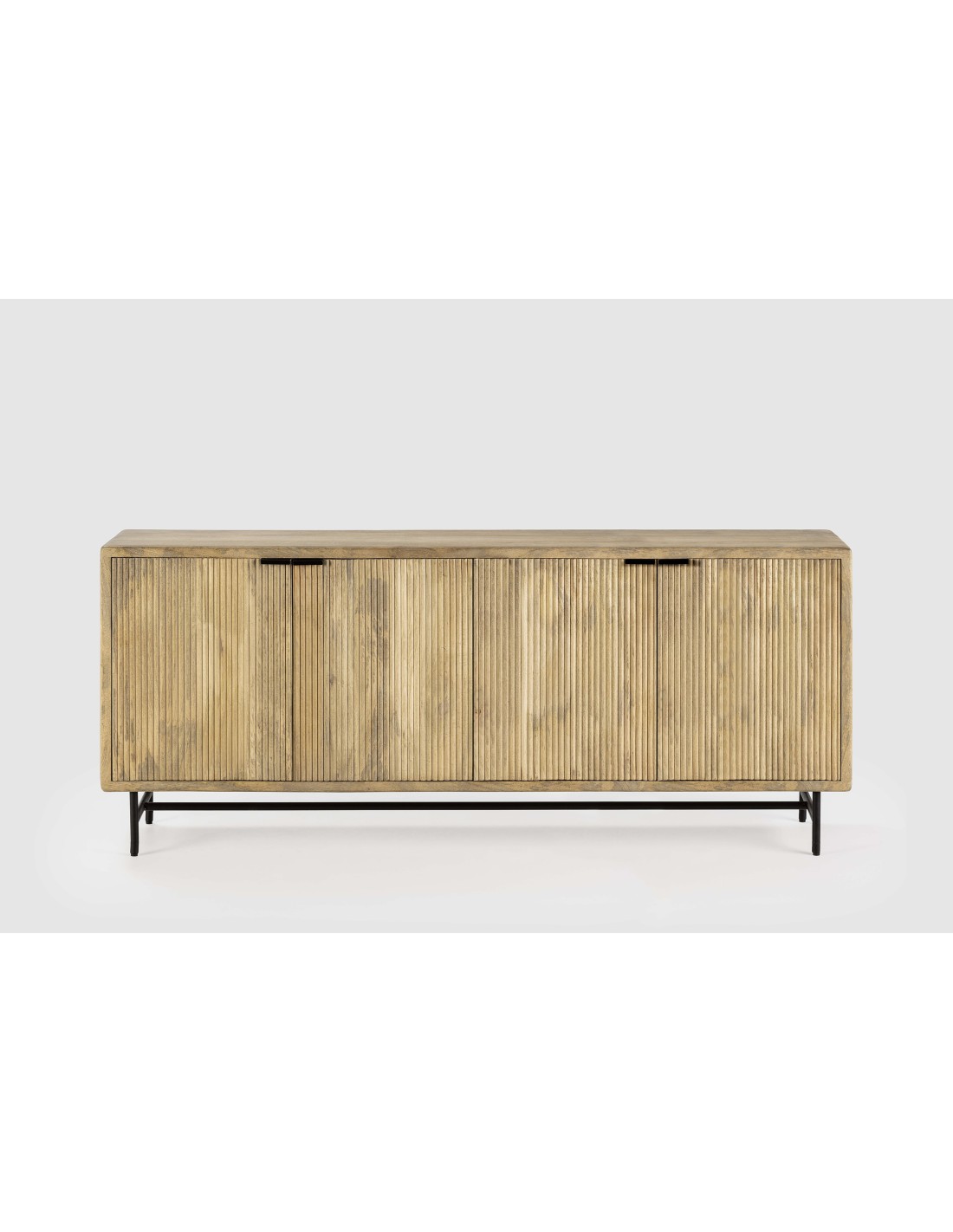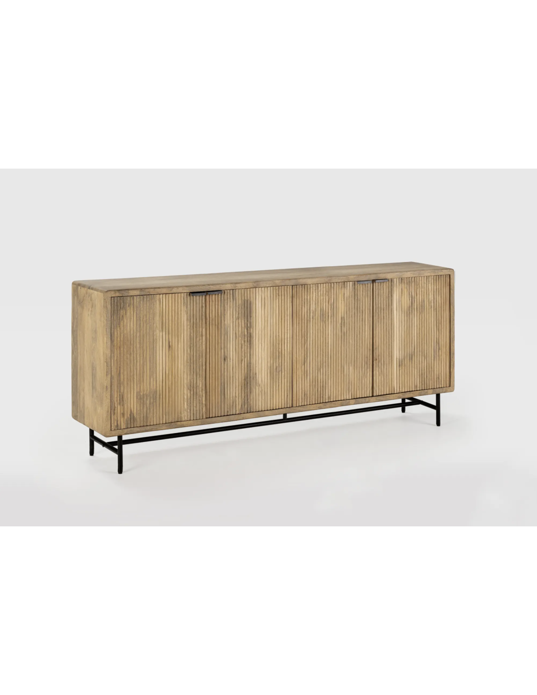 Aparador elaborado en madera maciza de mango proveniente de la lndia, con cuatro puertas grabadas con diseño acanalado y patas de metal.
