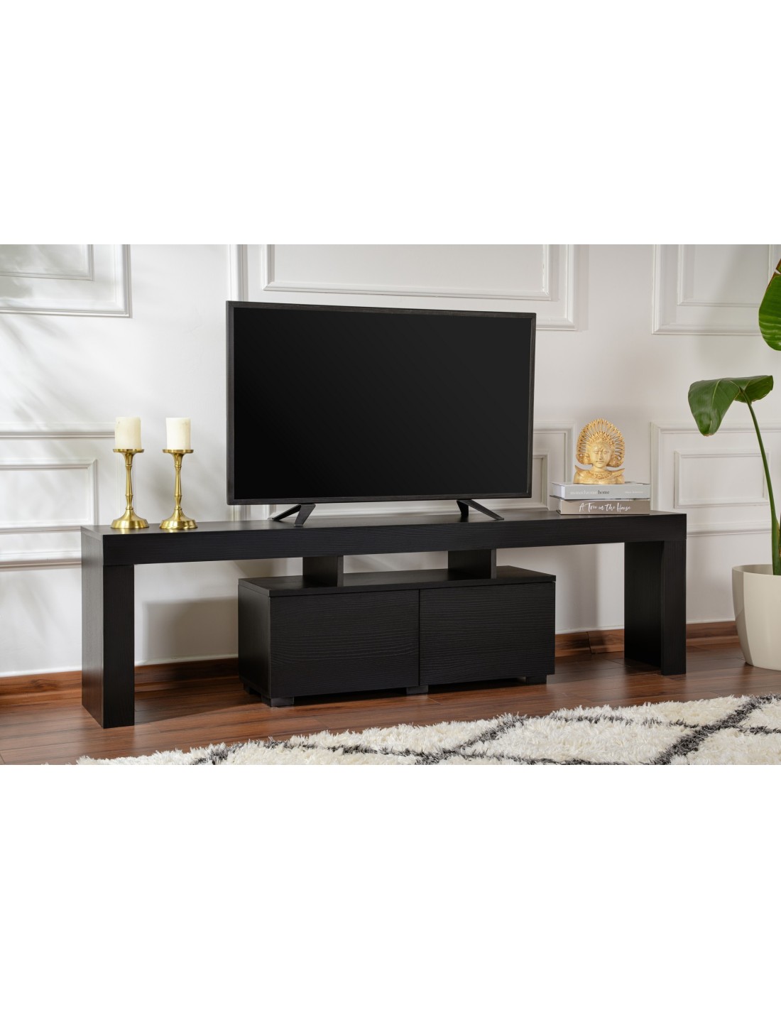 Eleva tu sala de estar con este elegante mueble de TV que no sólo proporciona un punto focal con estilo, sino que también ofrece un amplio espacio de almacenamiento para todos tus elementos esenciales. Sus líneas limpias y acabado negro madera actualizarán al instante el aspecto de tu estancia, creando un ambiente acogedor para ti y tus invitados.