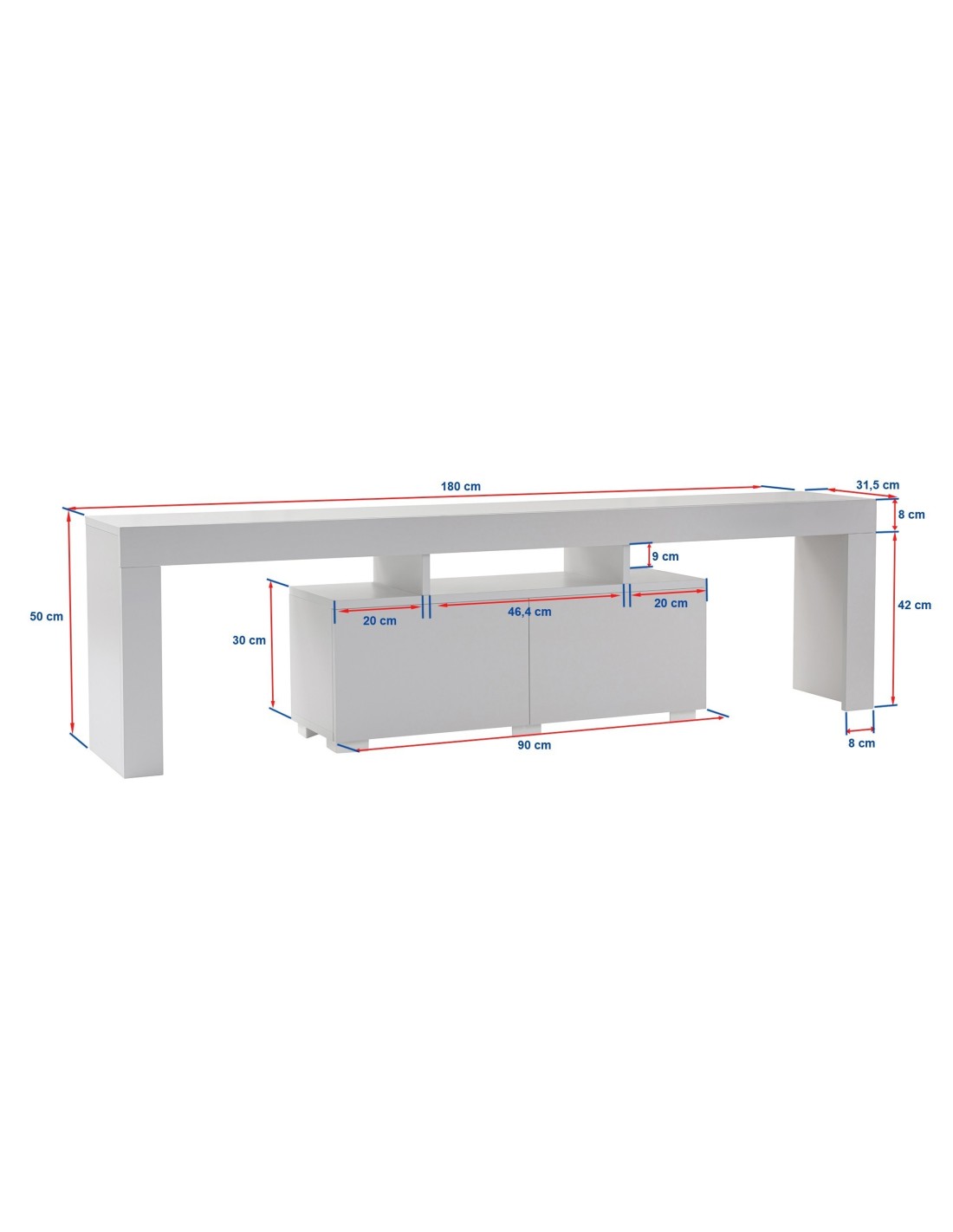 Fabricado 100% en tablero de partículas recubierto de melamina, este mueble de TV no sólo es resistente y duradero, sino también fácil de limpiar y mantener. El grosor de 18 mm garantiza estabilidad y robustez, mientras que sus generosas dimensiones ofrecen espacio suficiente para colocar tu TV, consolas de juegos, sistema de sonido y mucho más.
