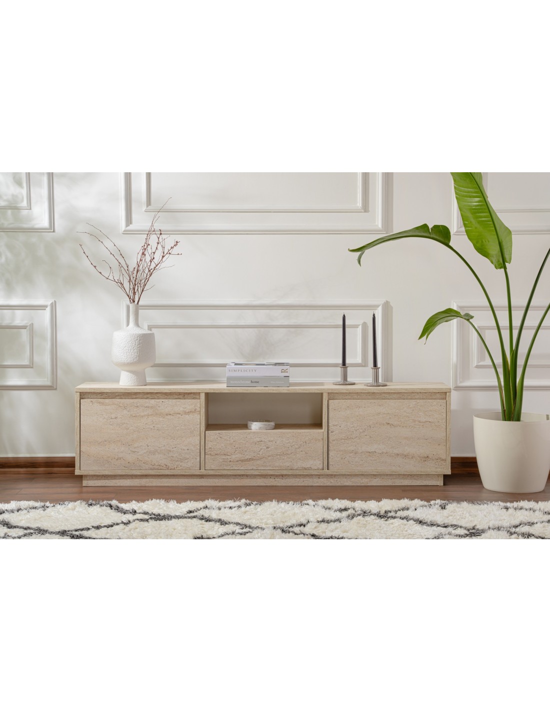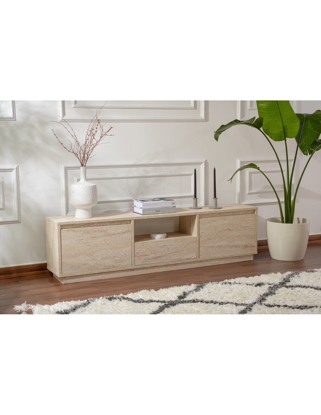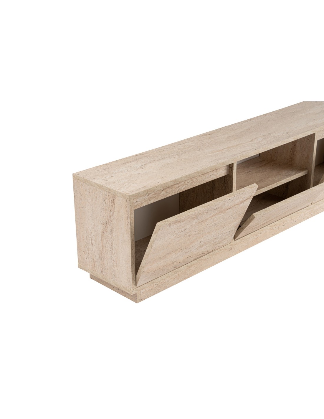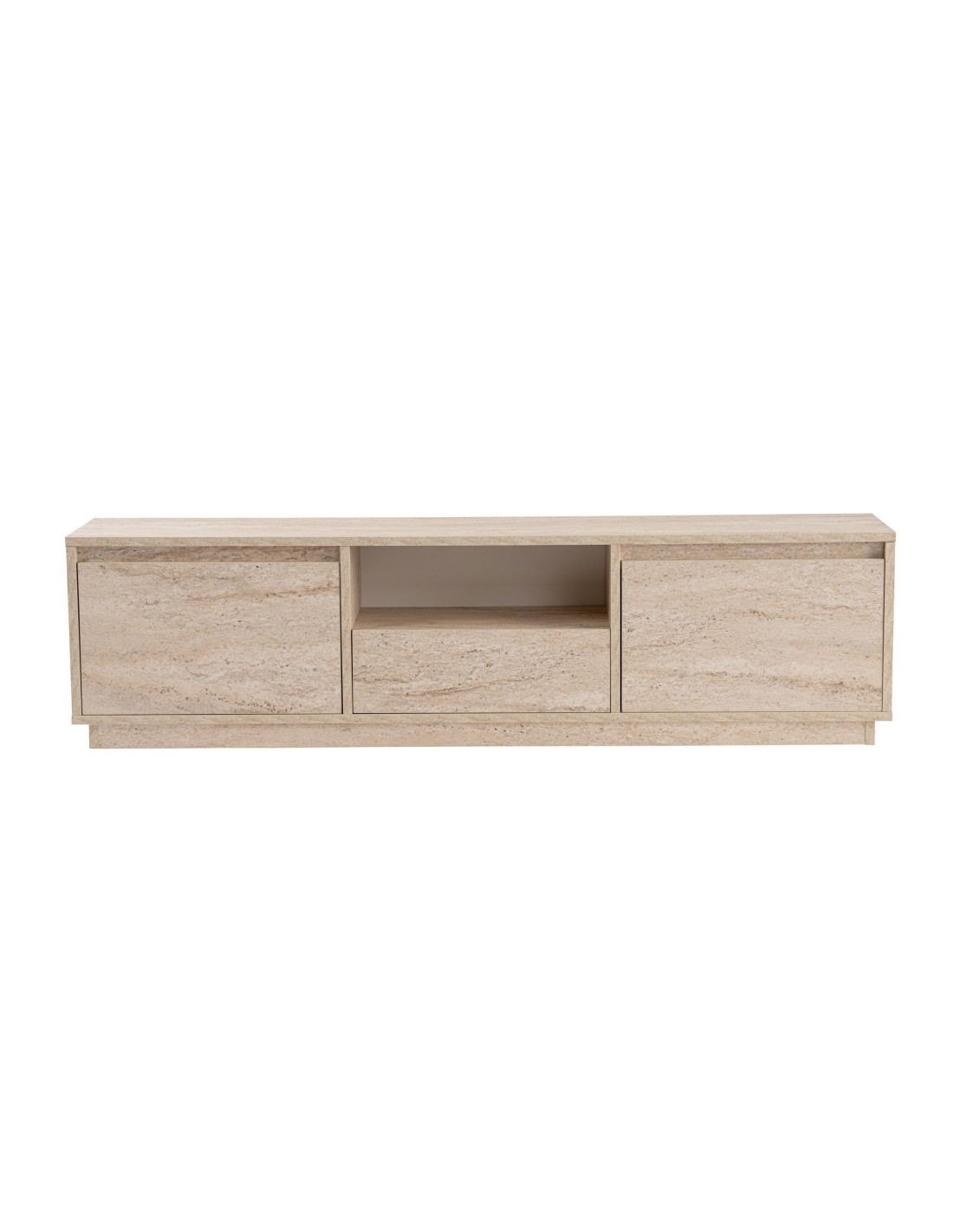 Despídete del desorden y da la bienvenida a un mueble de TV elegante y moderno que elevará al instante el aspecto de tu salón. El acabado travertino añade un toque de lujo, por lo que es la adición perfecta a cualquier estilo de decoración del hogar.