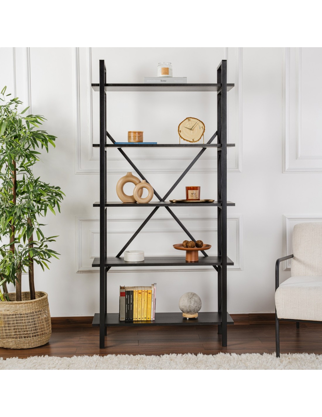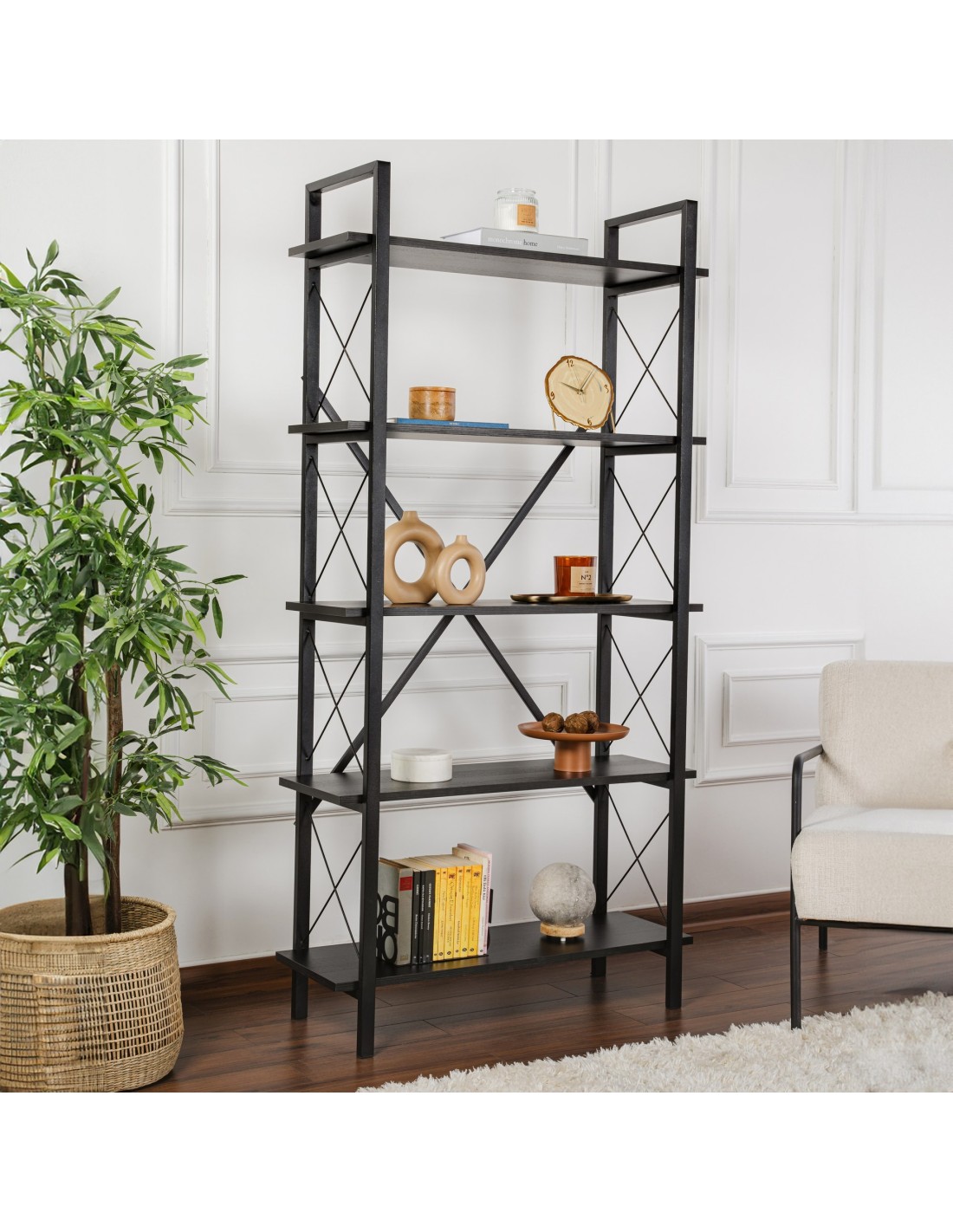 Di adiós a las pilas desordenadas de libros y hola a una estantería bellamente organizada que elevará instantáneamente el aspecto de cualquier habitación. Con su diseño elegante y su moderna combinación de acabados negro madera y negro, esta estantería es la adición perfecta para cualquier hogar u oficina.