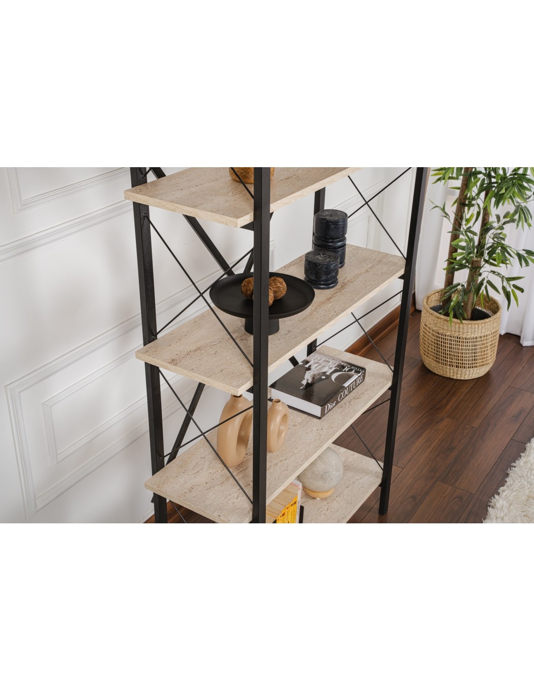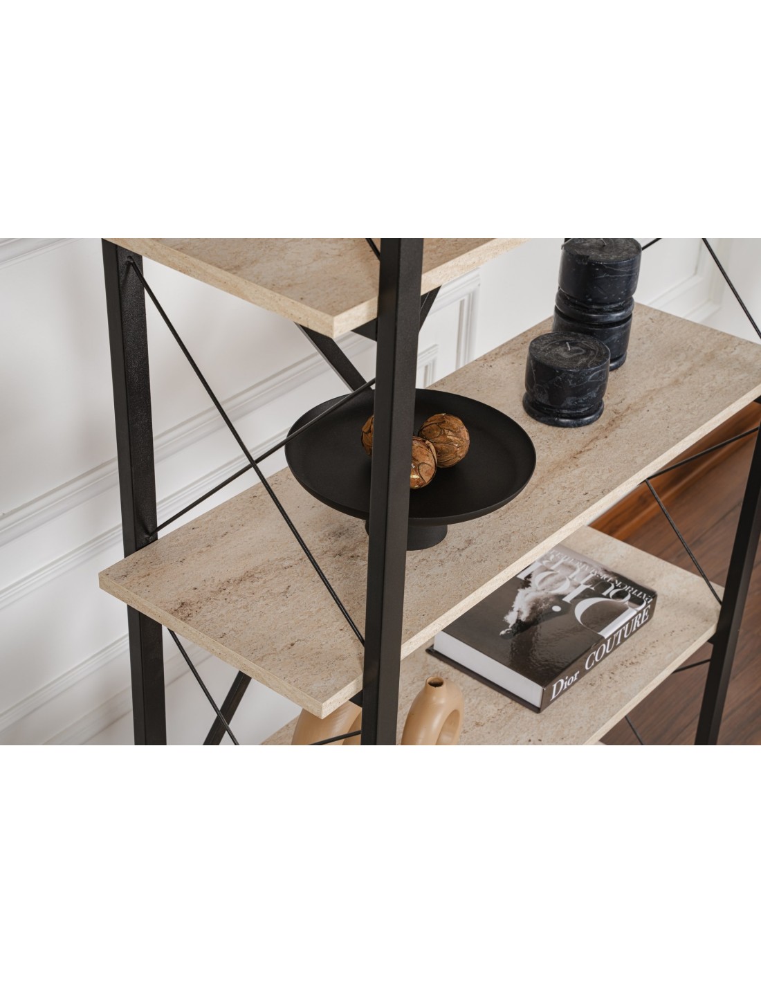 Di adiós a las pilas desordenadas de libros y hola a una estantería bellamente organizada que elevará instantáneamente el aspecto de cualquier habitación. Con su diseño elegante y su moderna combinación de acabados efecto travertino y negro, esta estantería es la adición perfecta para cualquier hogar u oficina.