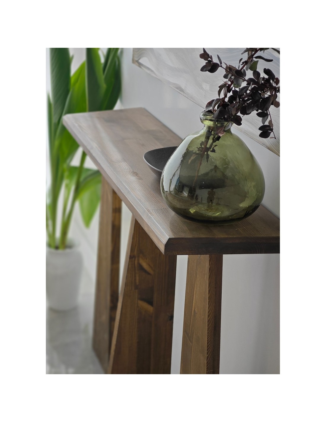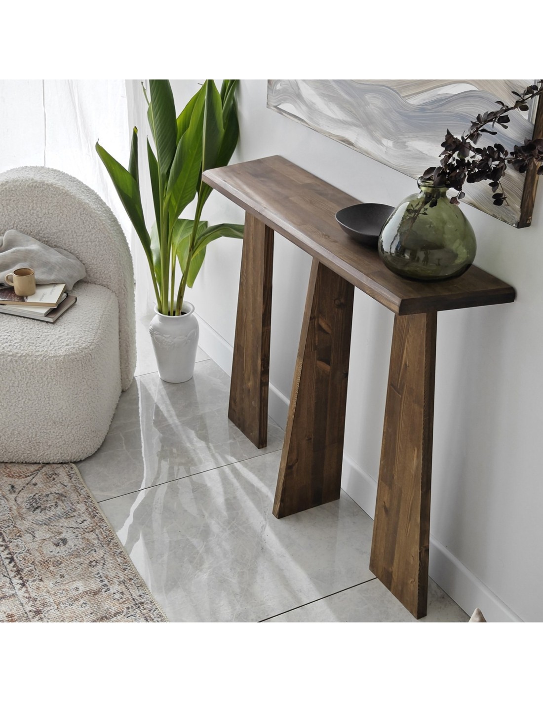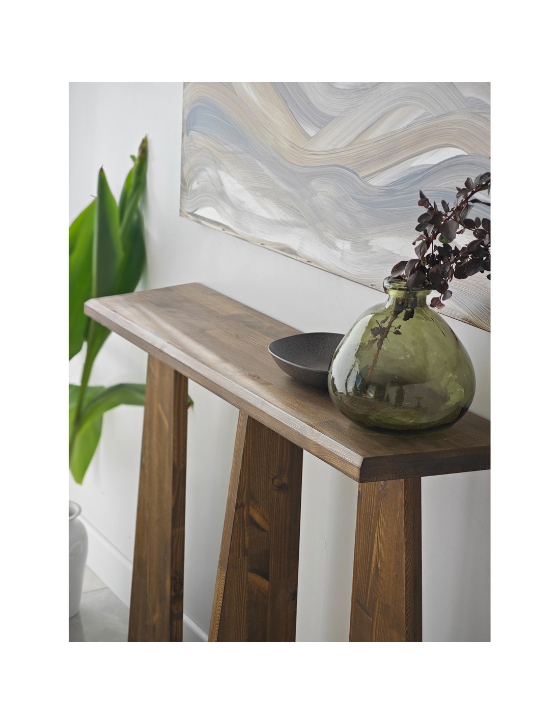 Presentamos la exquisita consola Satis acabado nogal, una pieza atemporal que aportará calidez y elegancia a cualquier estancia. Fabricada con el máximo cuidado y atención al detalle, esta consola está hecha 100% de madera maciza, lo que garantiza su resistencia y longevidad.