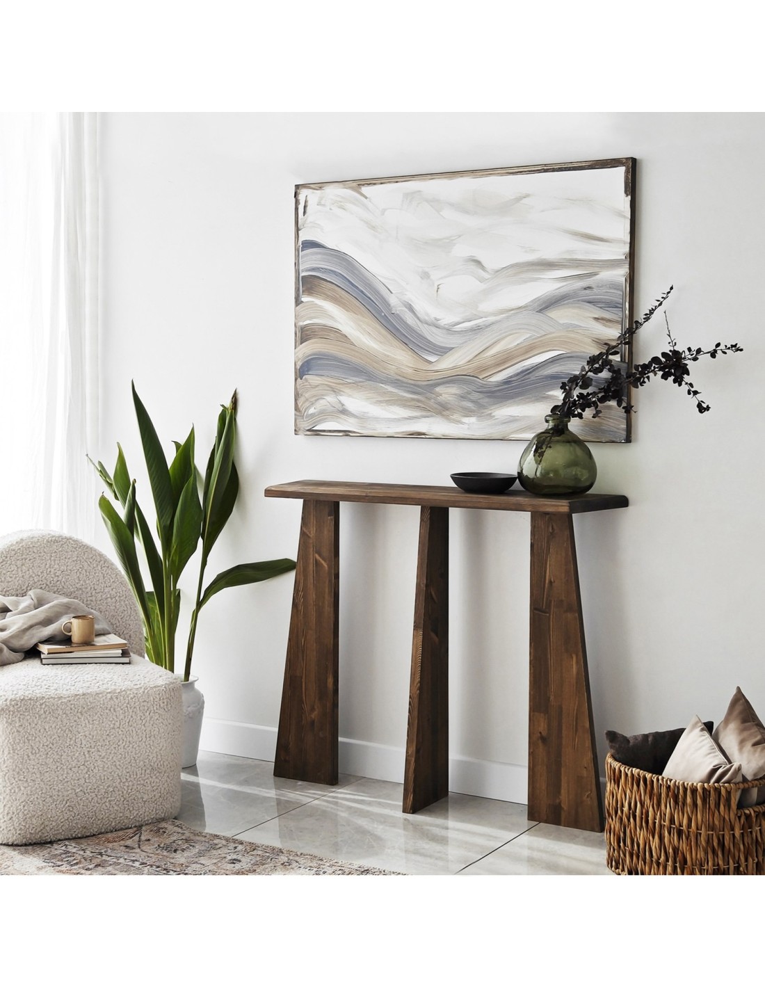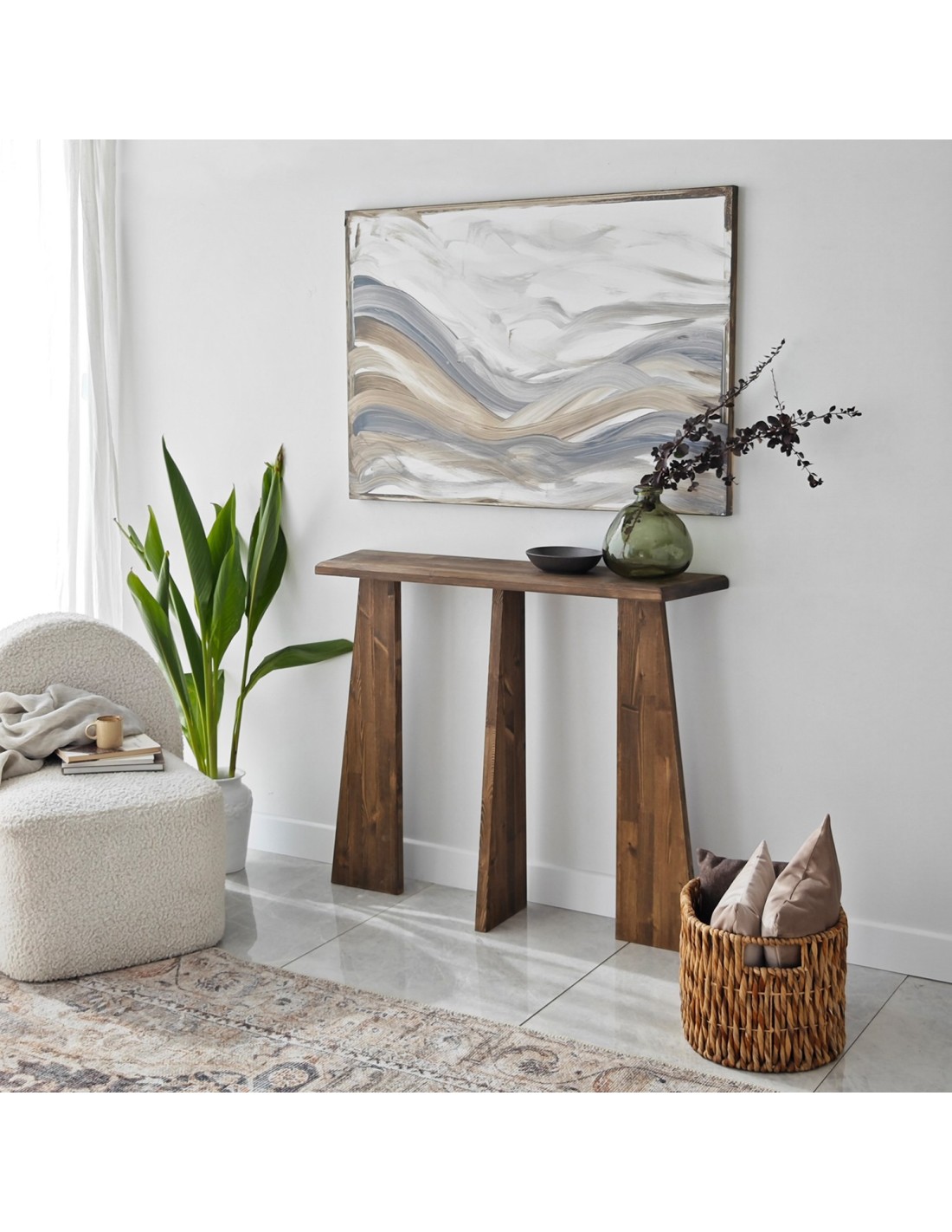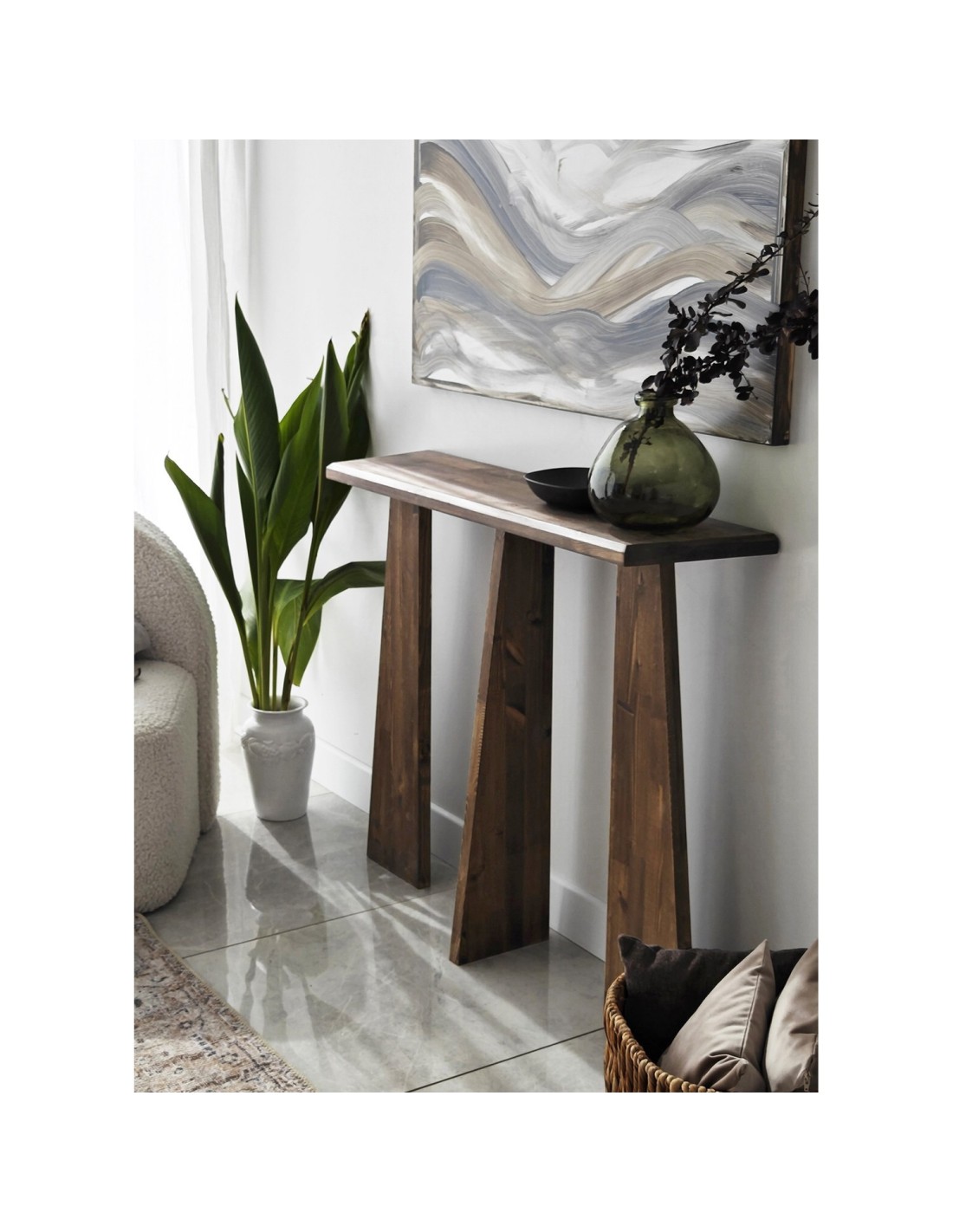Presentamos la exquisita consola Satis acabado nogal, una pieza atemporal que aportará calidez y elegancia a cualquier estancia. Fabricada con el máximo cuidado y atención al detalle, esta consola está hecha 100% de madera maciza, lo que garantiza su resistencia y longevidad.