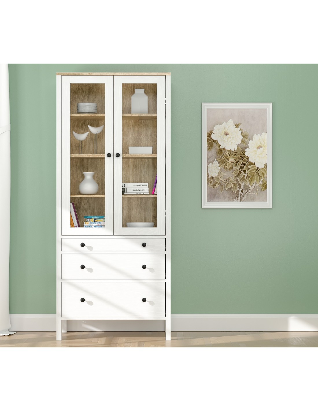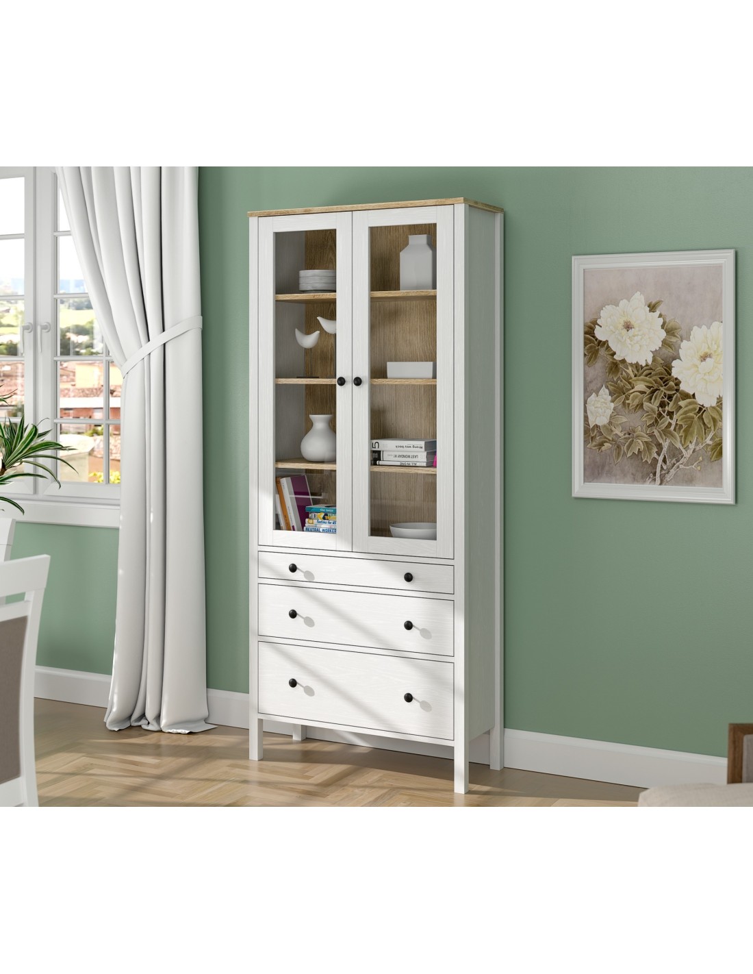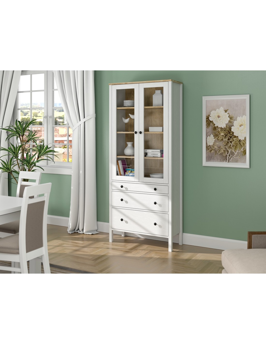 Gracias a su diseño elegante y acabado en madera blanca, esta vitrina elevará al instante el aspecto de cualquier estancia con un toque de calidez y luminosidad, convirtiéndola en la adición perfecta a cualquier espacio decorativo.