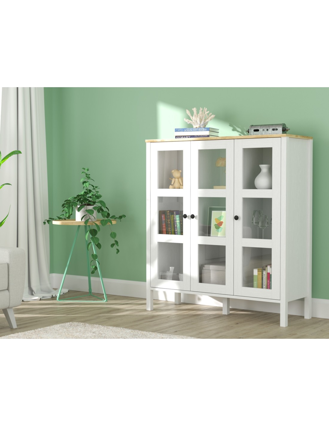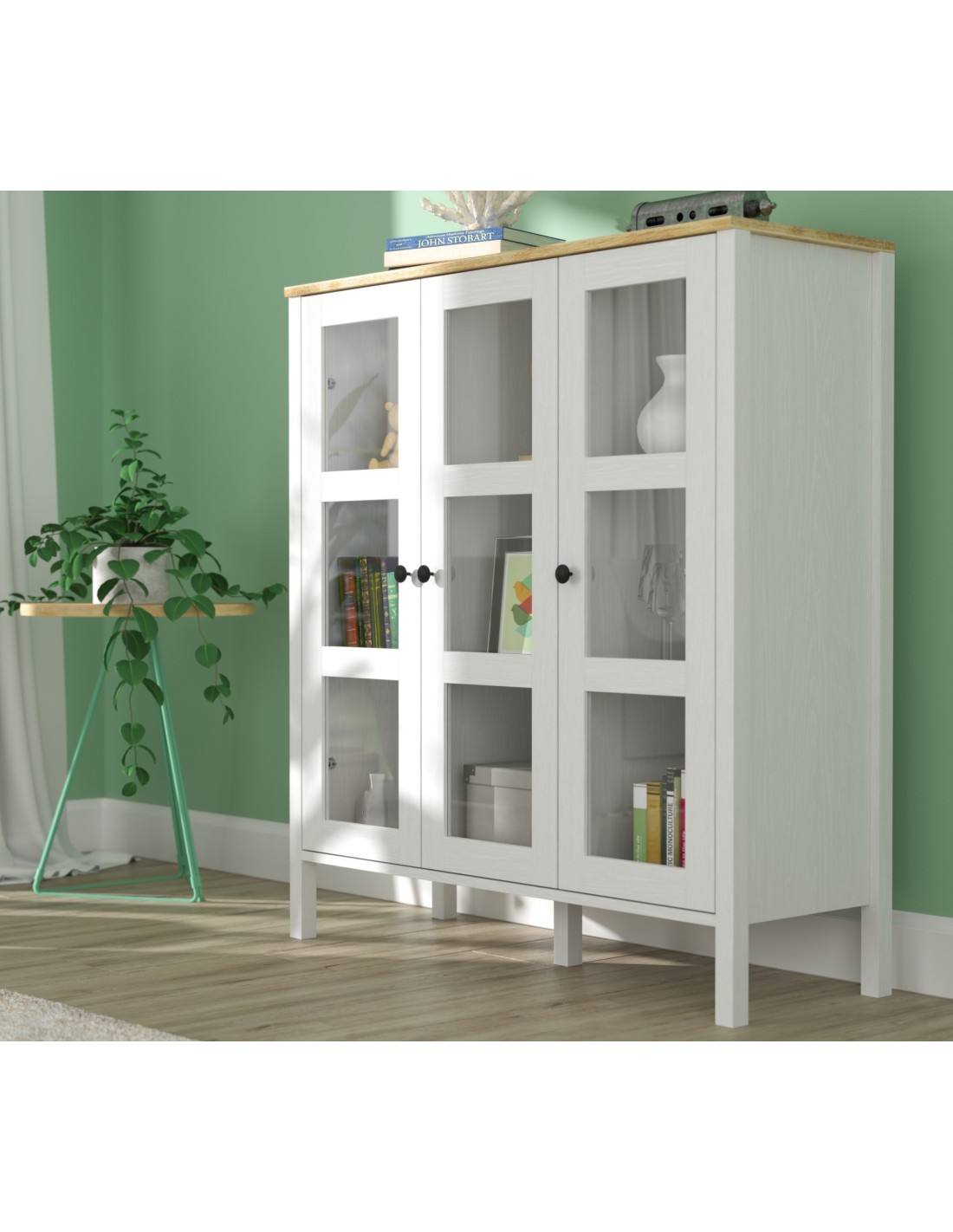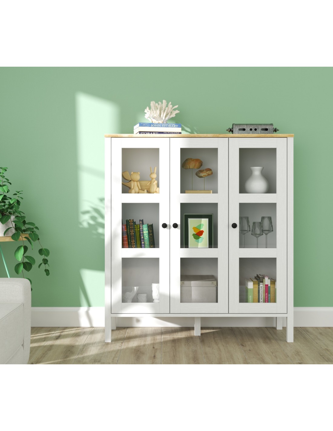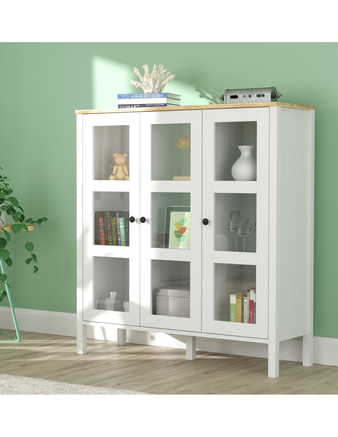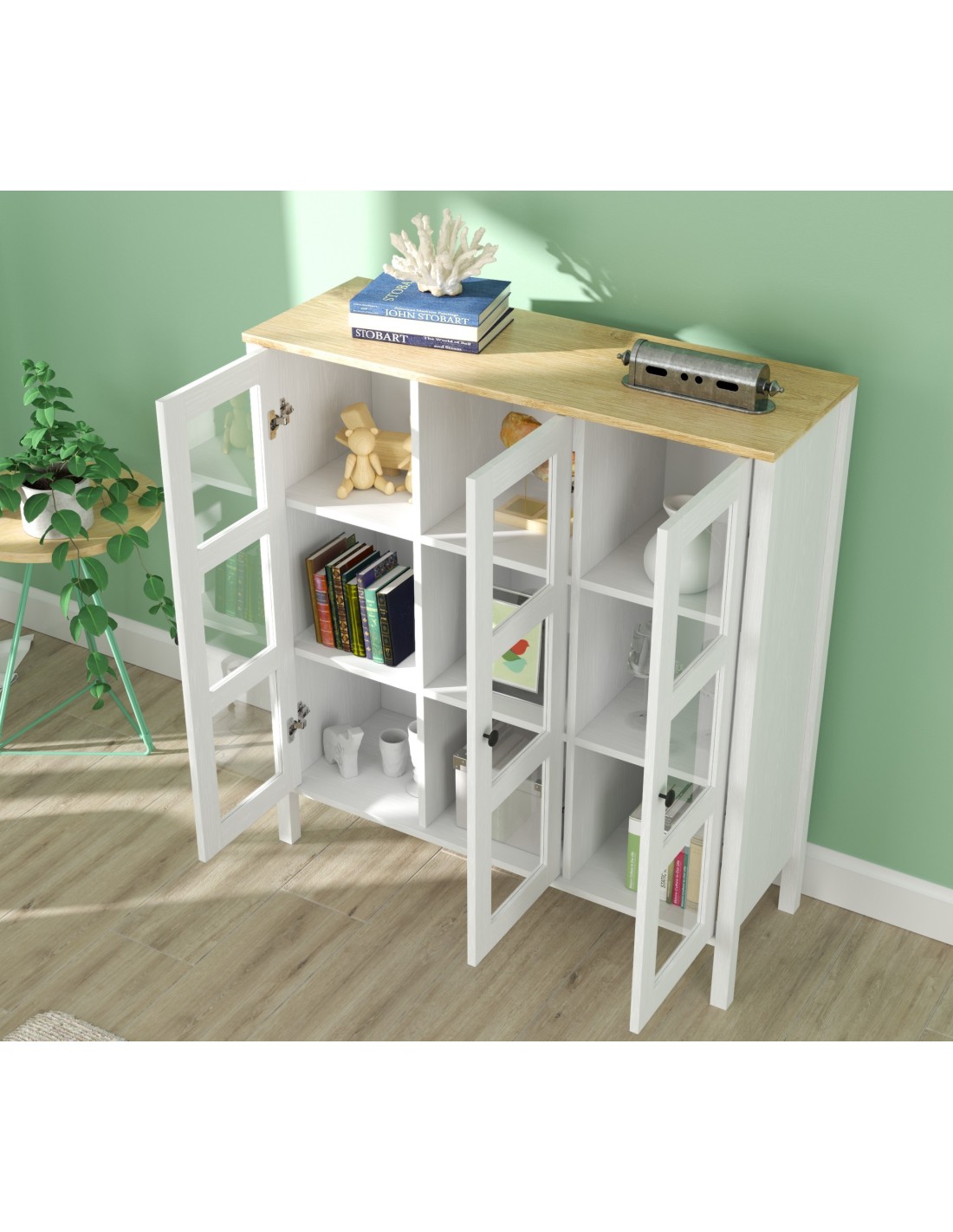 Gracias a su diseño elegante y acabado en madera blanca, esta vitrina elevará al instante el aspecto de cualquier estancia con un toque de calidez y luminosidad, convirtiéndola en la adición perfecta a cualquier espacio decorativo.