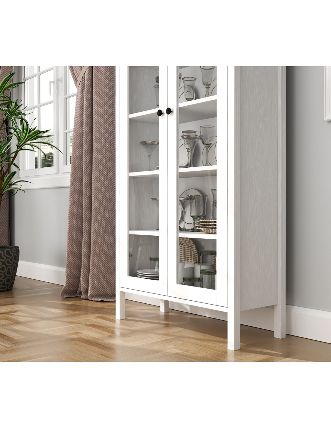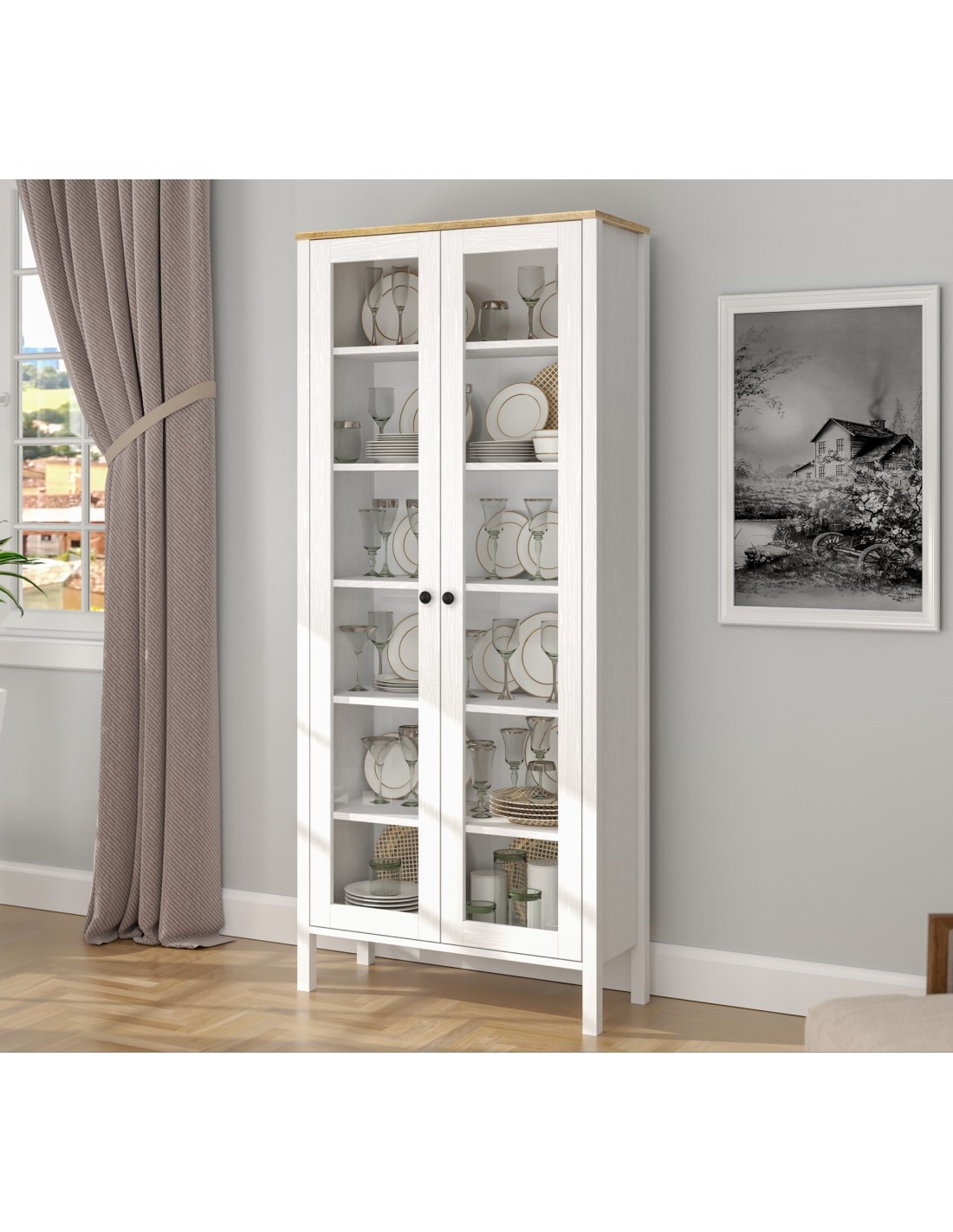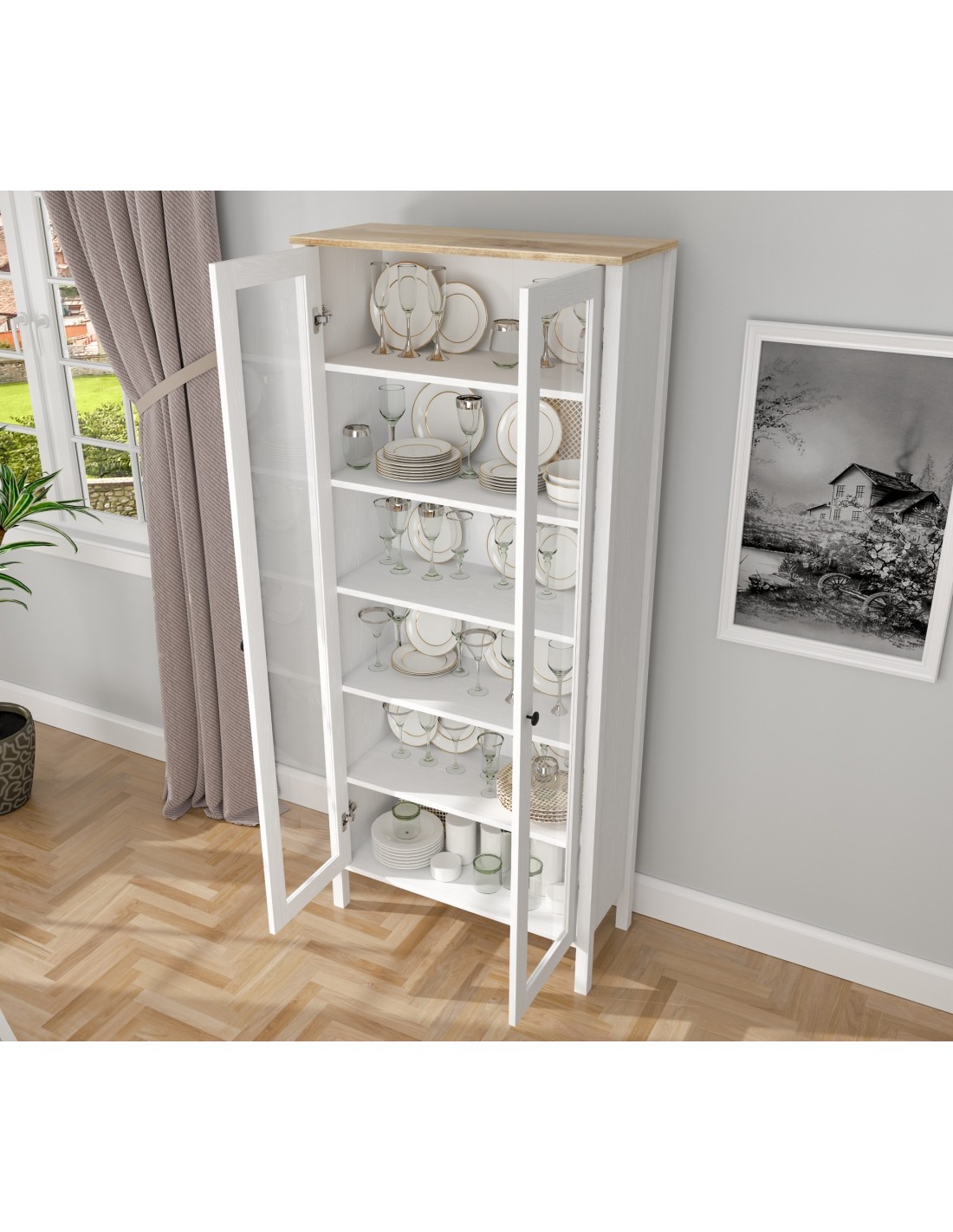 Gracias a su diseño elegante y acabado en madera blanca, esta vitrina elevará al instante el aspecto de cualquier estancia con un toque de calidez y luminosidad, convirtiéndola en la adición perfecta a cualquier espacio decorativo.
