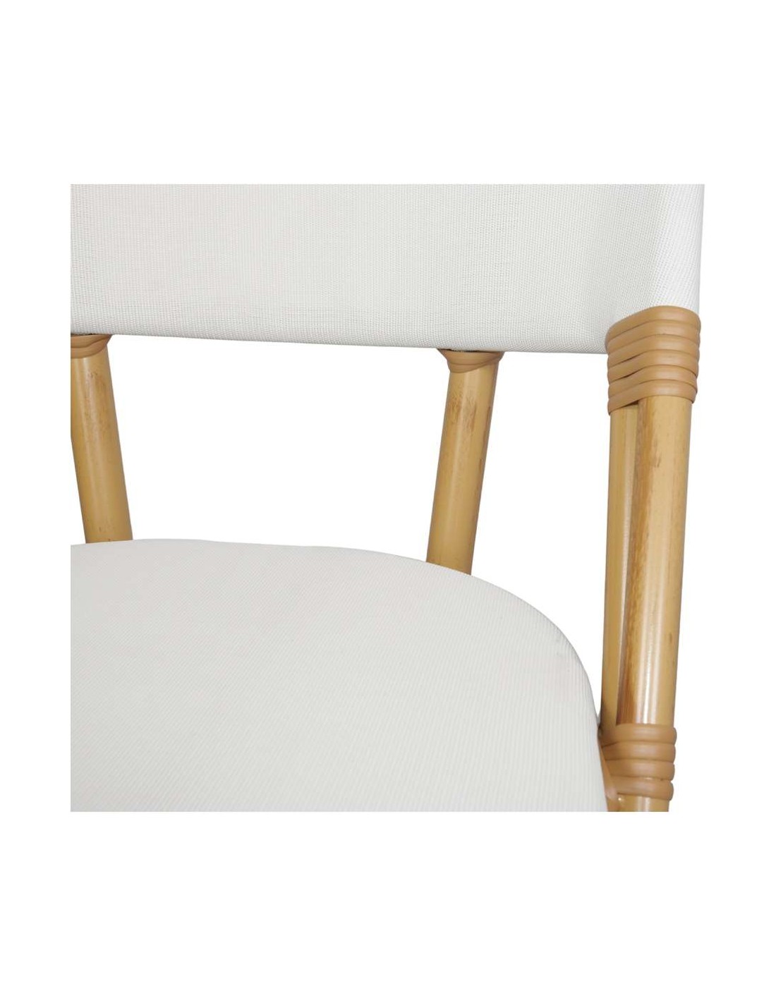Silla estilo Bistró inspirada en la icónica silla #14 del diseñador Michael Thonet. Cuenta con estructura tubular en aluminio soldado acabado efecto madera de bambú y asiento con respaldo tapizados en fibra de Textilene (poliéster) color beige. Apta para uso exterior.