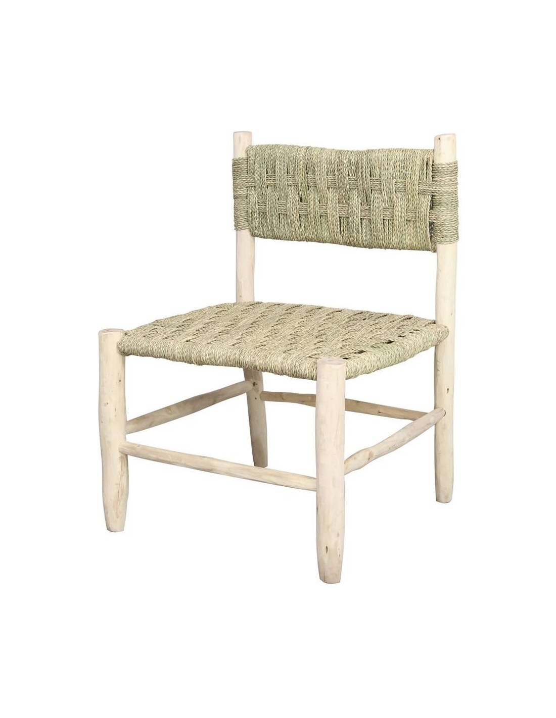 Silla con brazos estilo rústico, con estructura elaborada en madera maciza de laurel acabado natural y asiento y respaldo trenzados en fibra de palma acabado natural.