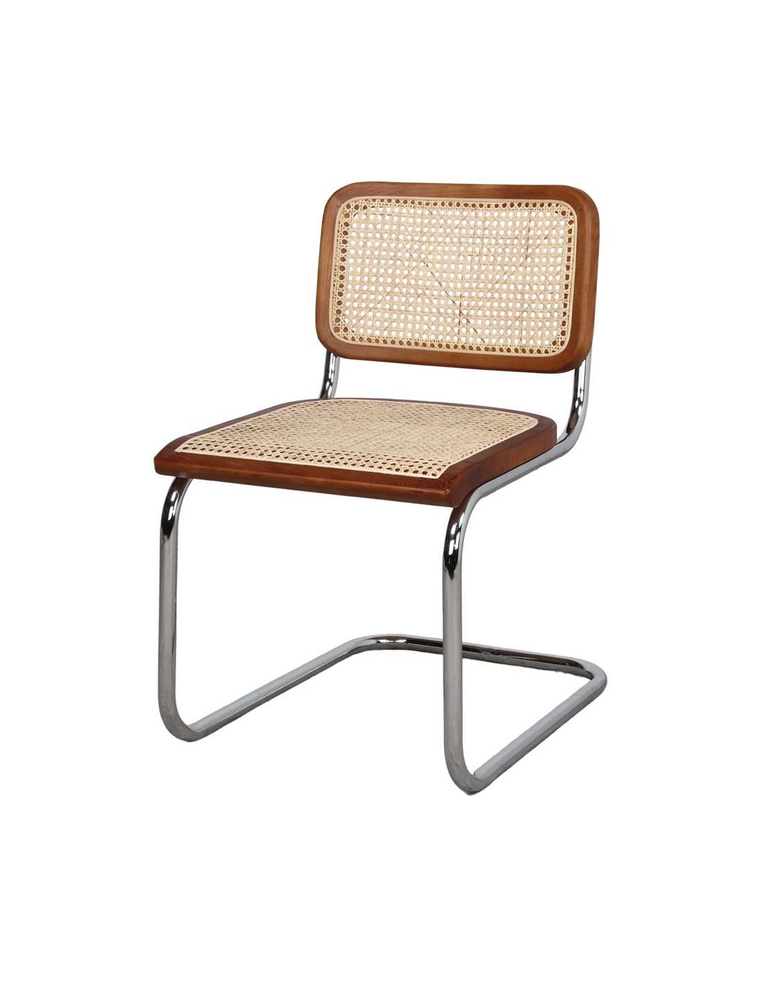 Silla de rejilla Kiev, tipo Cesca (Marcel Breuer, 1928). Estructura tubular de acero con acabado cromado. Asiento y respaldo fabricado en madera y rejilla de enea.