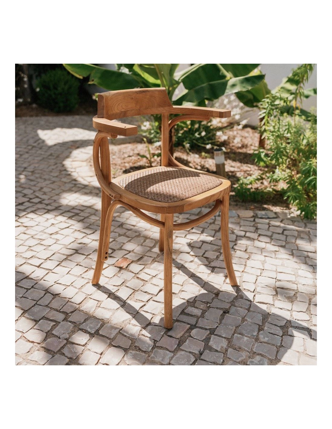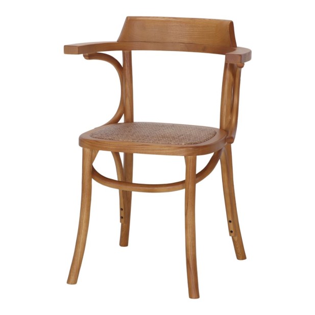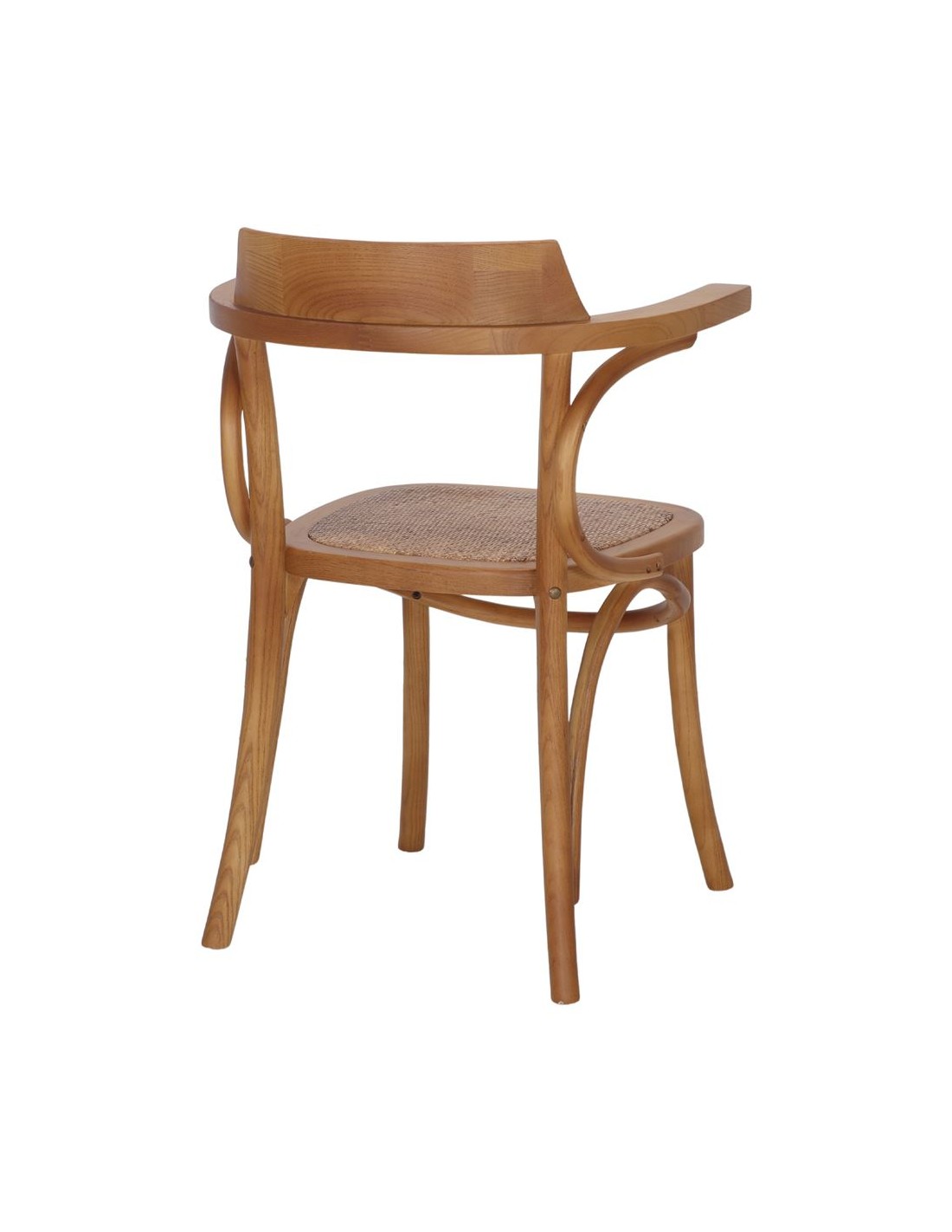 Silla con brazos estilo 'Bistró - Thonet', elaborada en madera de olmo acabado roble natural, con asiento tapizado en fibra de ratán natural trenzado. Una pieza ligera, confortable y robusta. Ideal como silla de comedor o silla de escritorio, tanto en el hogar, como en locales de hostelería.