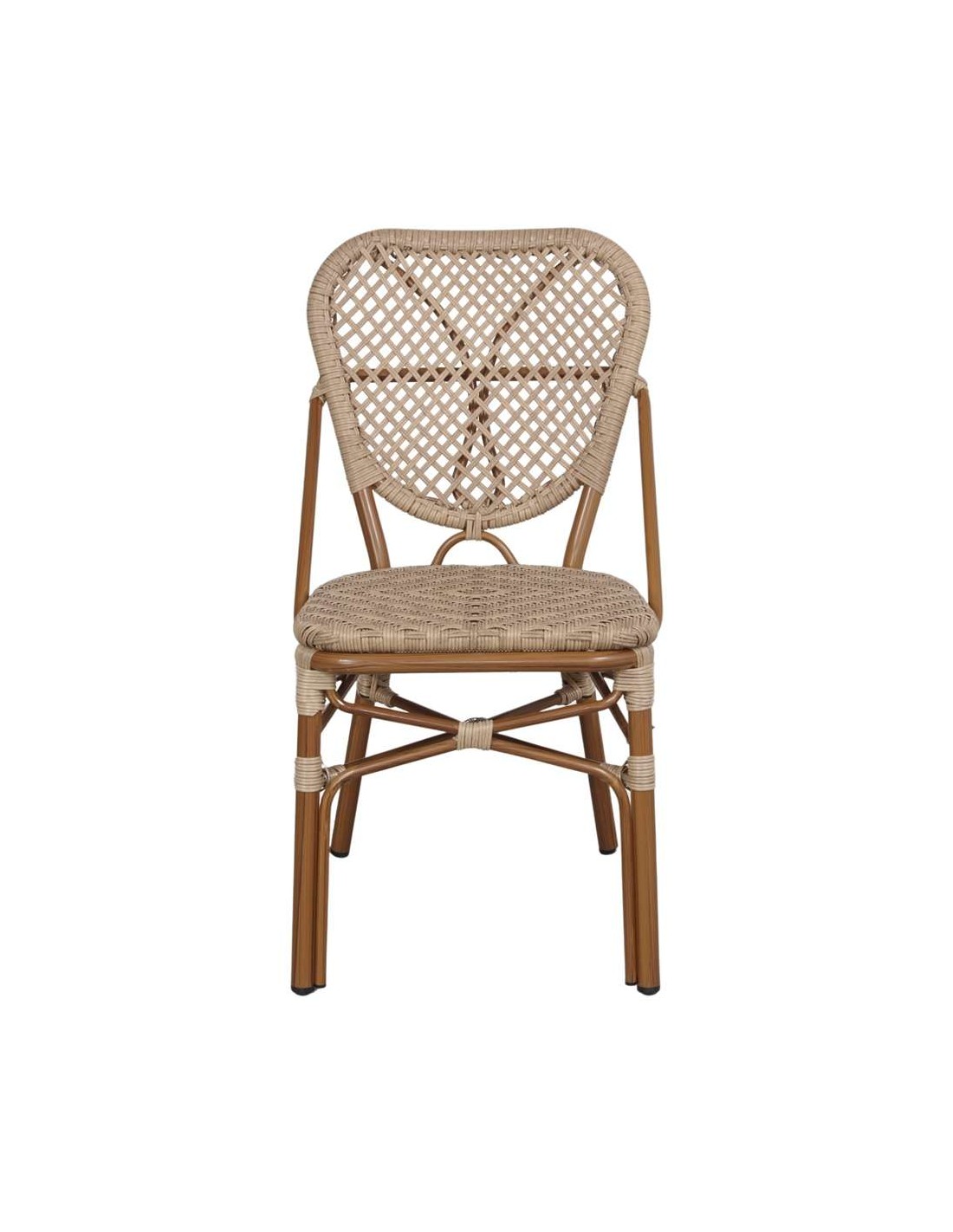 Silla estilo Bistró - Vintage, con estructura en aluminio pintado efecto bambú, asiento en ratán sintético acabado natural y respaldo en rejilla estilo cannage a tono. Es perfecta para dar un toque de distinción a la decoración de exteriores como terrazas, patios o jardines. Además es una silla muy confortable, gracias a la flexibilidad que ofrece el ratán sintético. Es ideal para el hogar o también locales de hostelería y restauración. Apilable.
