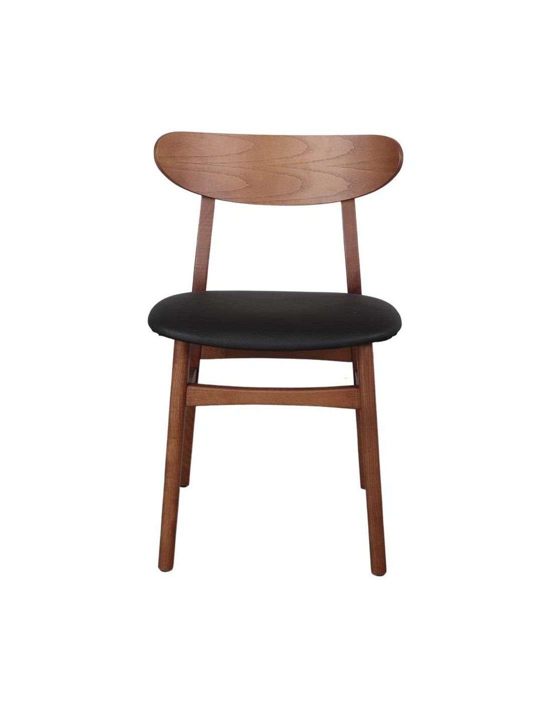 Silla de diseño estilo Nórdico, con estructura en madera maciza de fresno acabado barniz y asiento acolchado, tapizado en polipiel color negro. Su diseño de elegantes curvas en combinación de madera y textil, la hacen perfecta para añadir un toque de carácter y distinción al espacio donde se use. Es ideal para el hogar y también para espacios de hostelería y restauración.