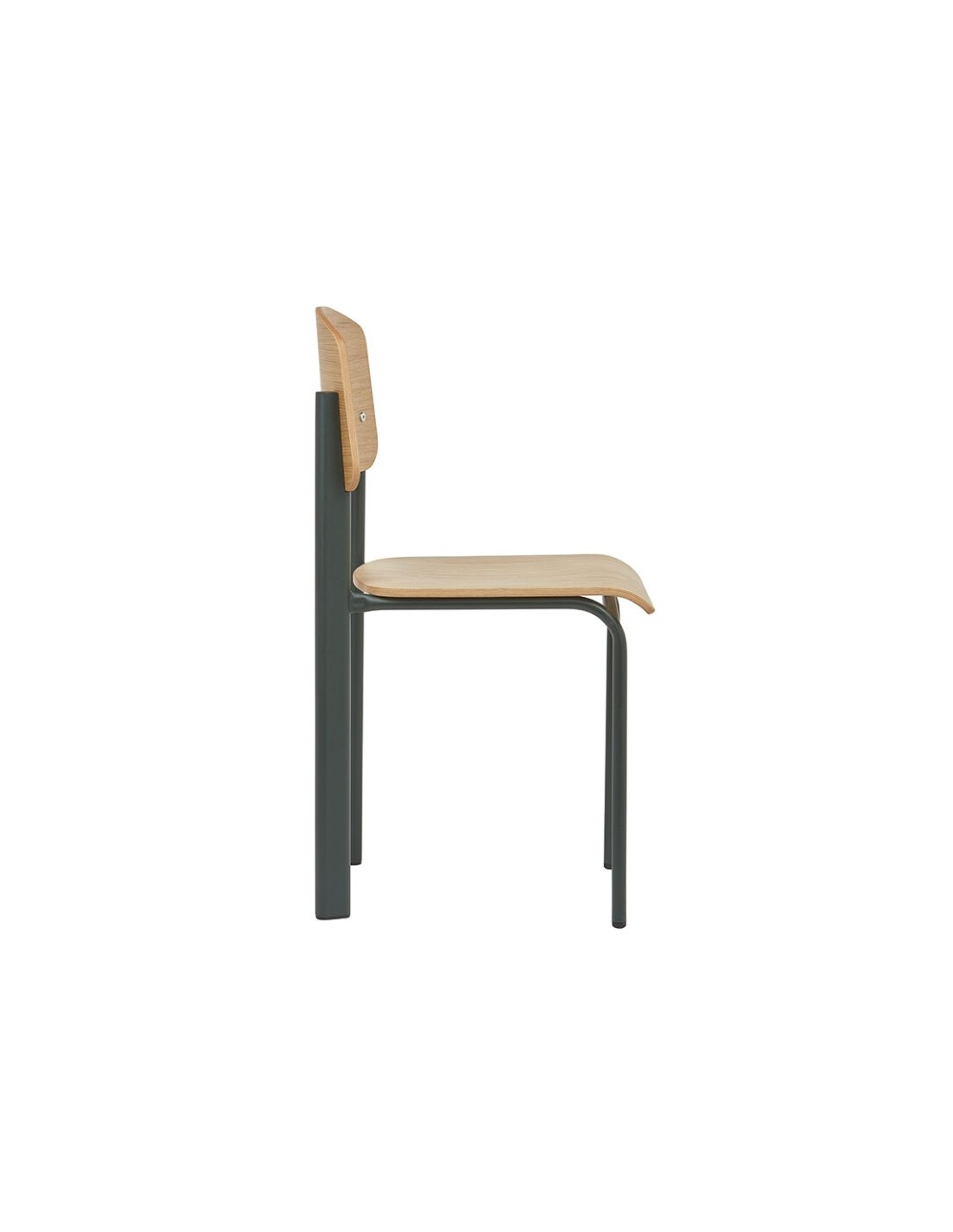 La silla es una inspiración de la silla Standard de Jean Prouvé. Está fabricada en acero negro en su estructura y asiento y respaldo de madera plywood de haya. La historia de la silla Prouve viene de la aplicación de la idea de que las sillas soportan más tensión en las patas traseras, ya que son ellas las que absorben el peso de la parte superior del cuerpo. Su creador utilizó esta premisa para el diseño de la silla Prouve: mientras que las patas delanteras, que soportan un peso relativamente pequeño, son de acero tubular, las traseras son elementos huecos de gran volumen que transmiten la tensión al suelo.