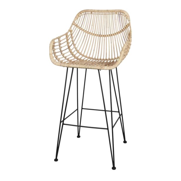 Taburete alto estilo Nórdico, con estructura tubular en acero y asiento con brazos y respaldo, elaborado en ratán natural. Esta combinación de materiales y su confortable diseño de líneas curvas, lo hacen el complemento ideal para añadir un toque muy nórdico al salón de comedor o cocina.