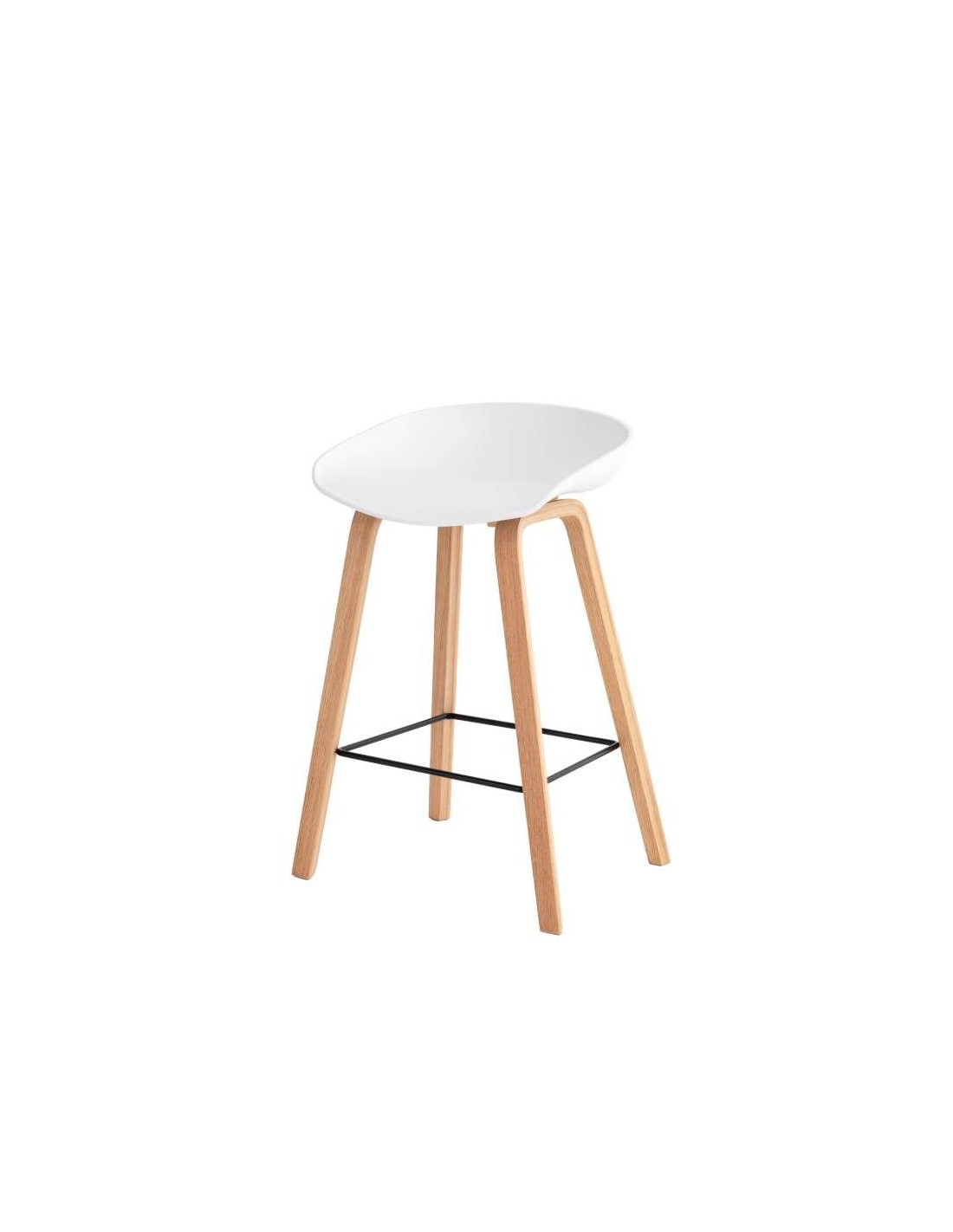Taburete alto con estructura elaborada en madera acabado natural y asiento con respaldo bajo en plástico acabado blanco. También en colores negro y gris.
